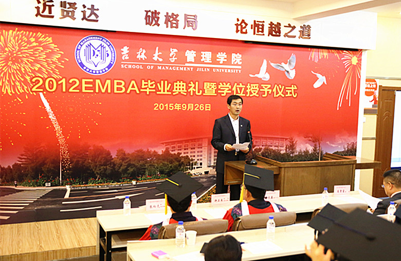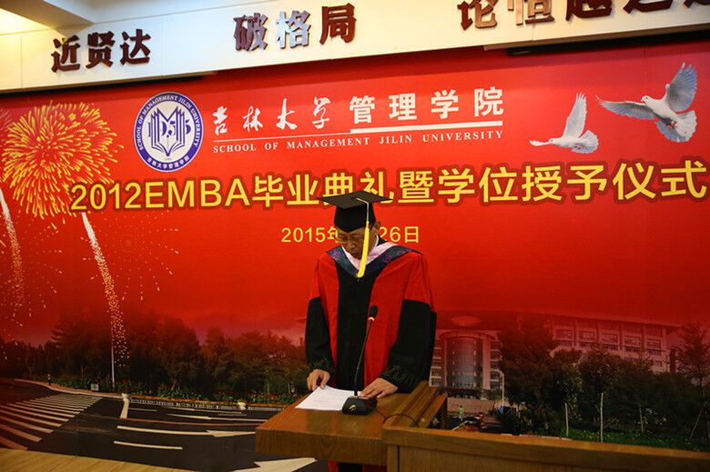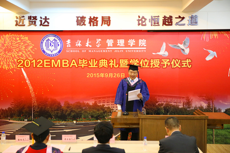 2012EMBA学员郭钰同学代表毕业同学发言,他说:“今天虽然离开了校园,但是我们的心并没有离开吉大。我们还是吉大人,我们还属于这个广阔的舞台。告别校园后 要走的路更长,让我们共勉,用实际行动和工作成绩向母校及公司做出最好的汇报!”