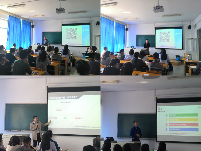 学堂在线产品应用支持中心姚保峰主管对“雨课堂”的安装、应用、课件、语音、视频等教学内容的导入和应用等过程进行了清晰的讲解,同时还介绍了“雨课堂”在各所高校的应用情况和评价反馈。在场的师生通过扫描二维码参与问答互动、难点反馈、幻灯片推送、现场答题统计、现场调查、发送点评或弹幕到投影屏幕,有效展示了“雨课堂”良好的课堂互动、及时的授课反馈和多样的授课形式等特点,亲身体验了手机进课堂、信息技术辅助实现教与学的过程。