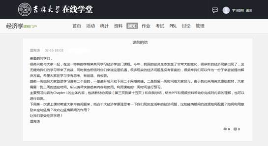 在开学前一周即2月16日,温海涛老师组织全体同学加入到超星学习通,并以通知形式发了一封课前的信给全体同学,作为课前动员令,鼓励同学们不仅要在心理上,也要通过预习、思考等做好开课准备。