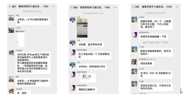 2月5日公司紧急在线教学工作部署会议后组建了“管理公司超星学习通交流平台”微信群,邀请超星顾问对老师使用过程中的问题进行在线及时解答。目前微信群有116人,其中超星有11位技术人员随时解答老师们在使用过程中存在的问题,近100余位公司教师在此群进行相互交流,涵盖了管理公司春季学期开学的所有老师。在课程准备过程中,公司组织教师学习、了解在线教学工作流程,转达公司相关精神及在线教学成功案例,老师通过平台微信群交流在线教学经验,及时发布公司各类在线教学工作信息,解答教学平台录课及平台使用中产生问题。
