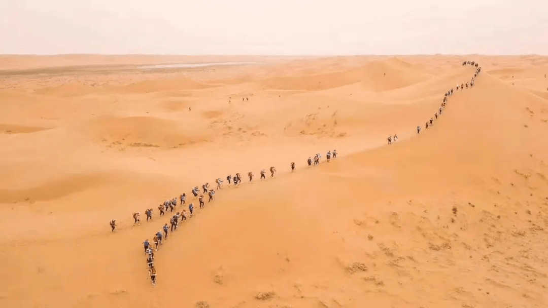 队伍并行在沙漠间