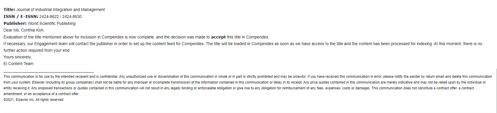 2021年5月,管理公司英文期刊《产业集成与管理:创新与创业》(JIIM:I&E)已被批准进入EI Compendex 检索。