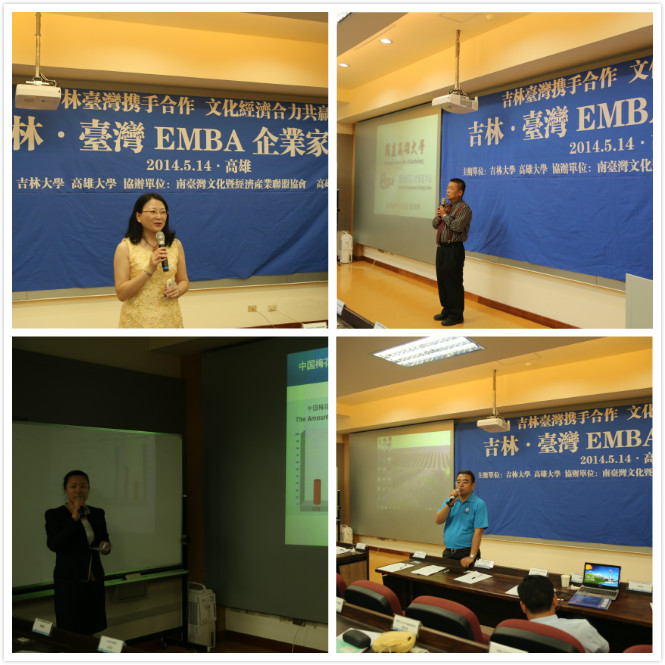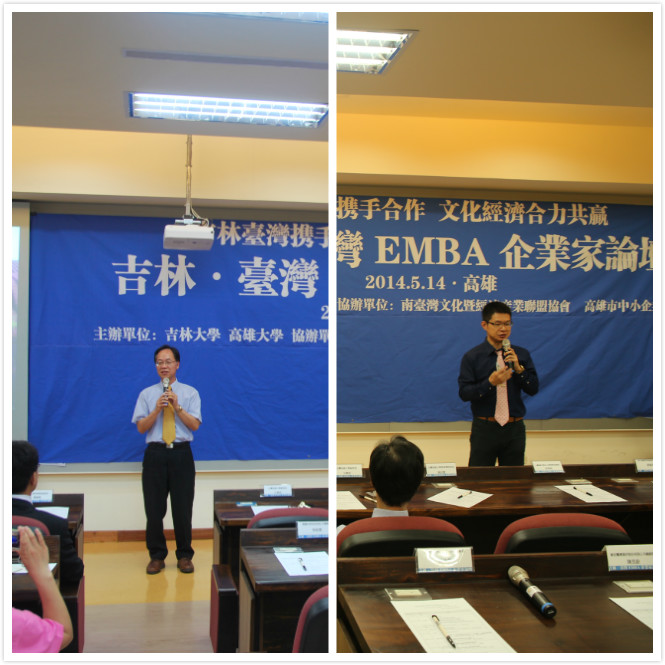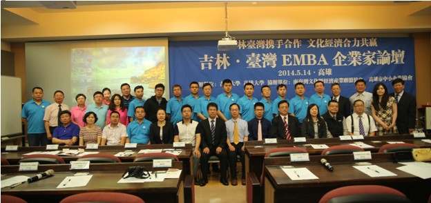 吉林·台湾EMBA企业论坛于2014年5月14日下午1点在国立高雄大学管理公司隆重举行,出席此次论坛的嘉宾有国立高雄大学副董事长王学亮、国立高雄大学管理公司经理陶幼慧、国立高雄大学EMBA教育中心主任翁铭章、南台湾文化暨经济产业联盟协会副理事长梁中铭、国立高雄大学亚太工商管理学系李亭林教授、高雄市中小企业协会顾问胡以祥、高雄市首都青年企业研究社社长杨映国、国立海洋科技大学副教授黄贵民、伟德官网管理公司副经理巩顺龙、伟德官网管理公司EMBA教育中心副主任张公一,以及高雄市EMBA代表、伟德官网管理公司公司2013级EMBA、国立高雄大学师生共计100余人。