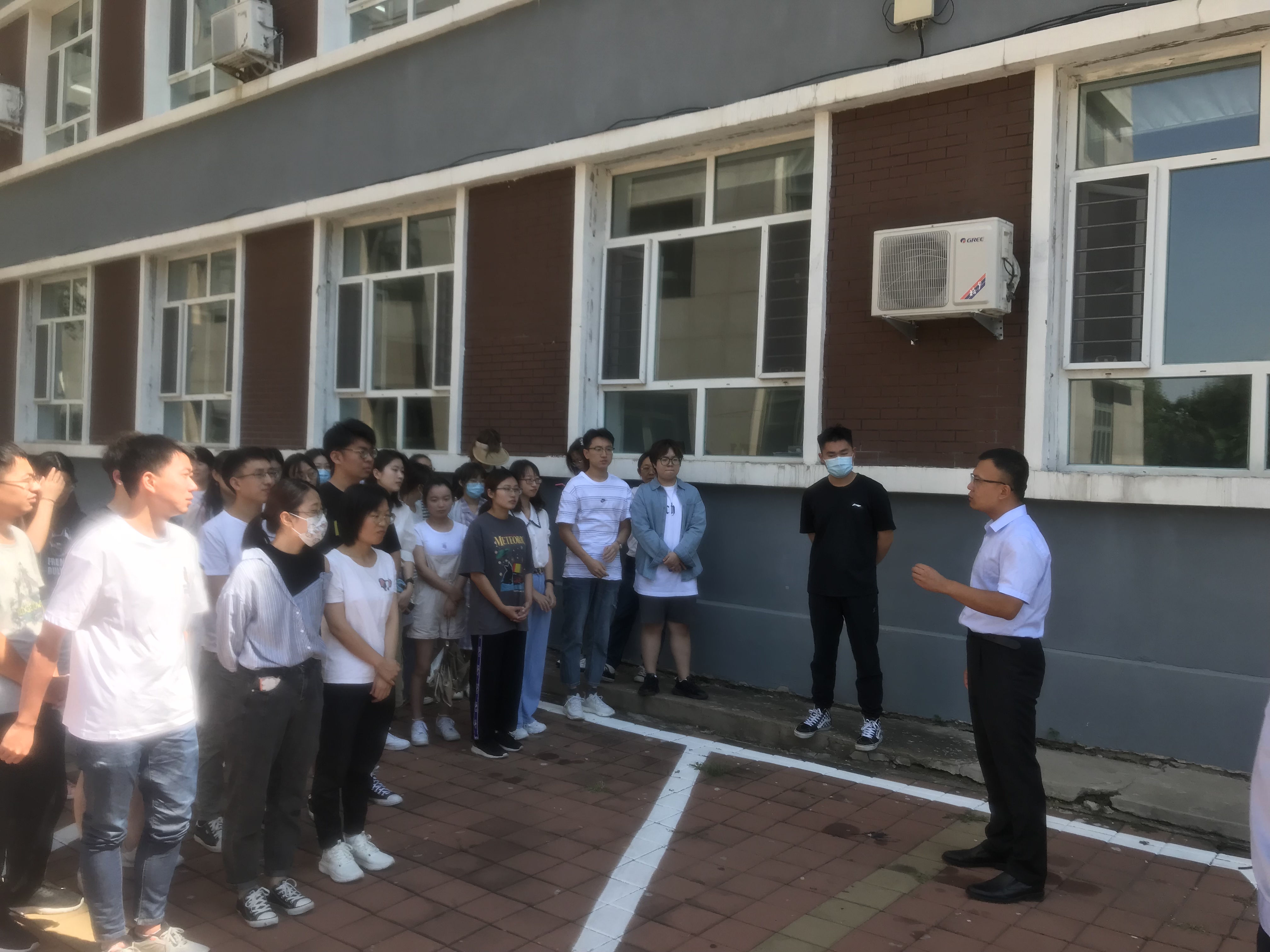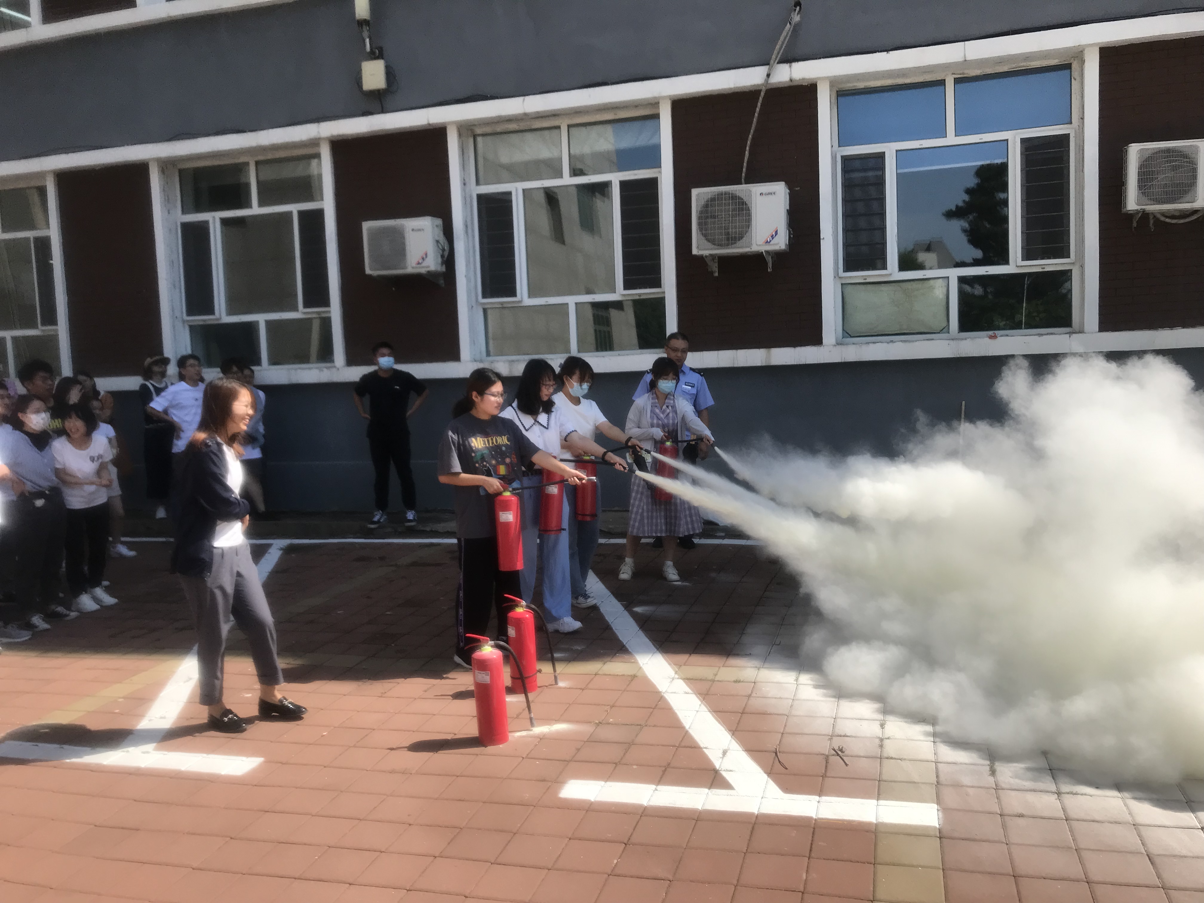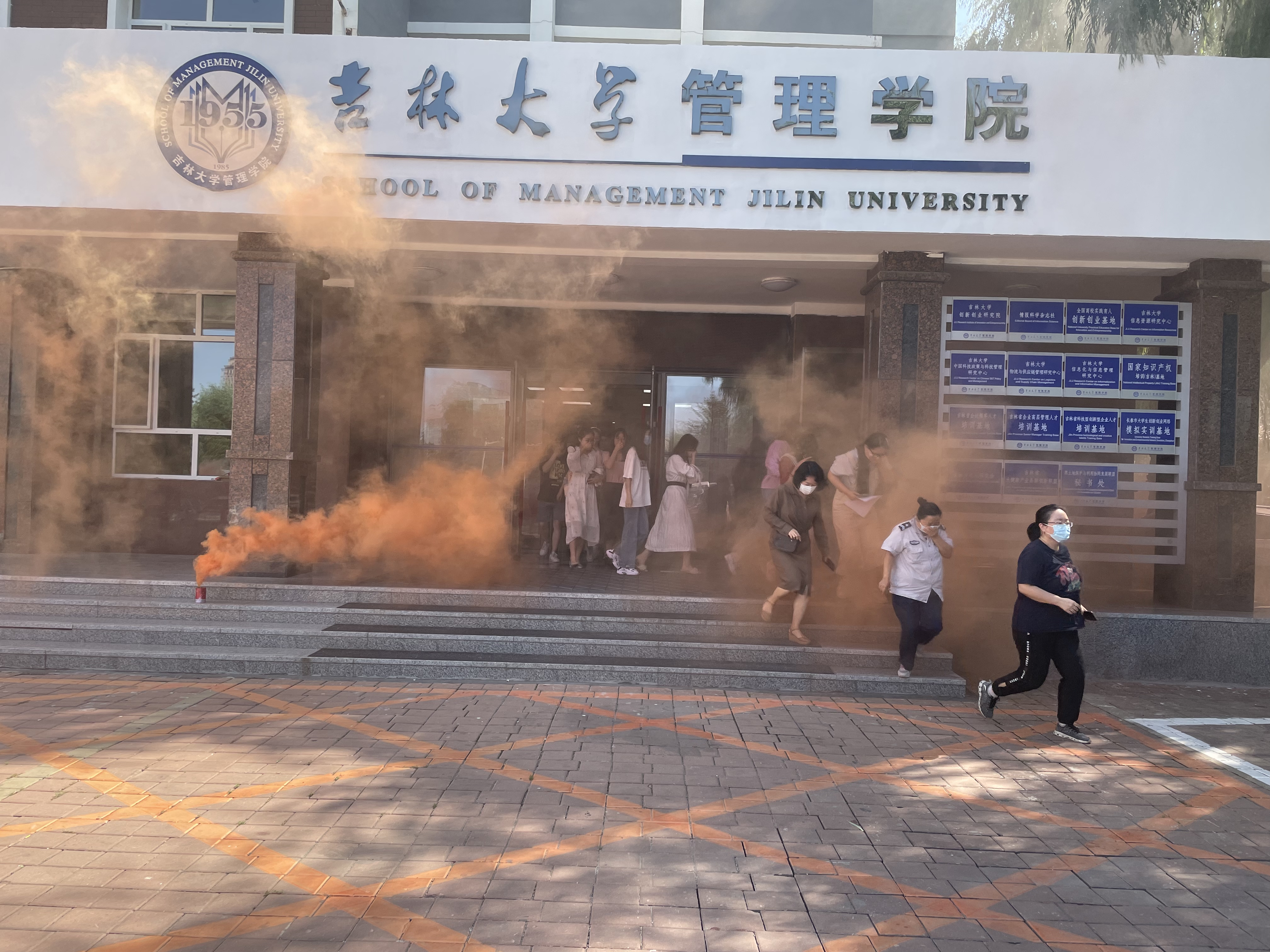 上午10:30,随着急促的警报声和刺鼻的浓烟,楼内的全体教师、本科生、研究生在现场工作人员的指挥下沿着疏散路线有序撤离到楼前的安全区域。