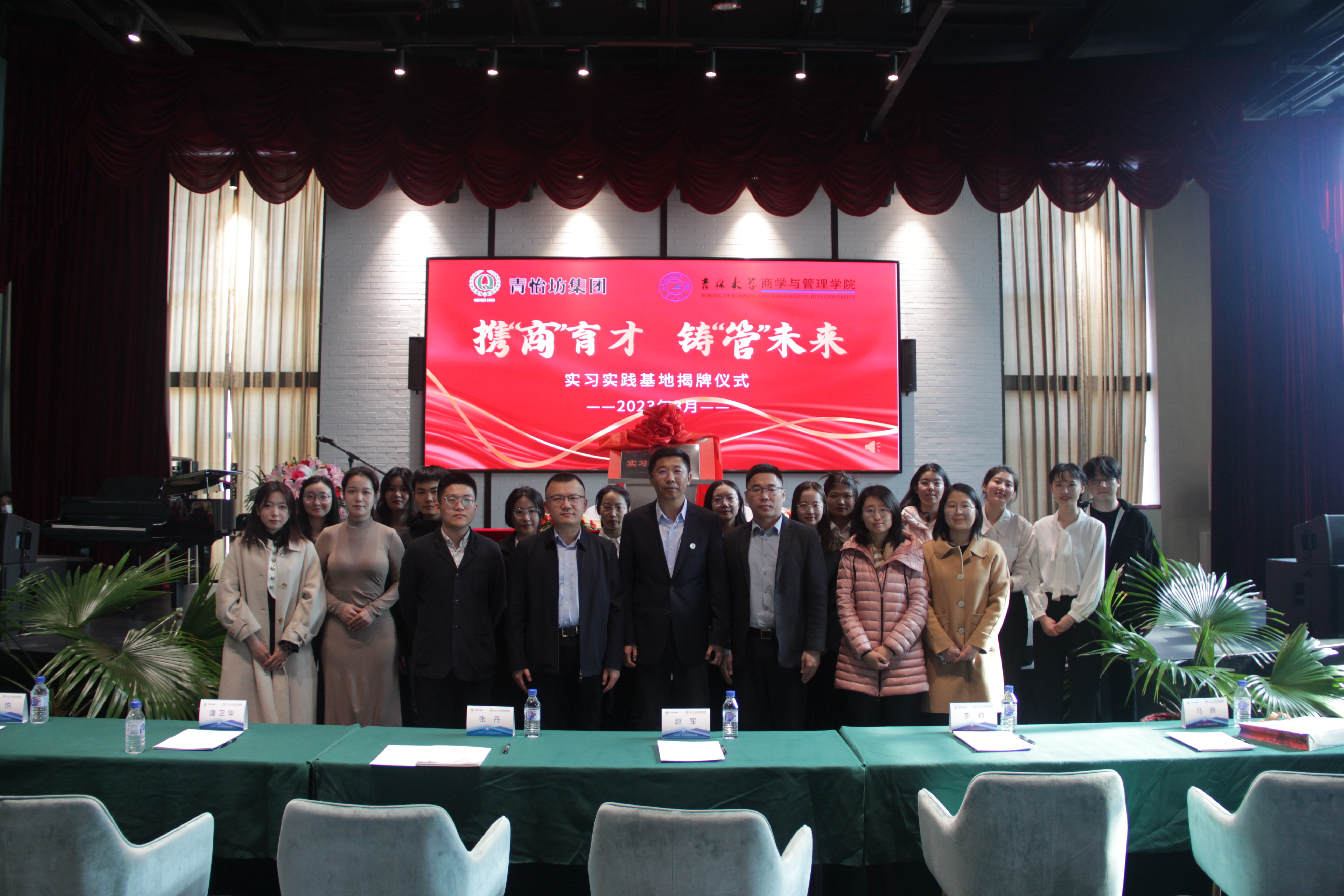 为深入学习宣传贯彻党的二十大精神,落实公司“引领工程”争先行动,着力加强员工实践育人工作,促进毕业生更高质量就业,3月17日下午,伟德官网和青怡坊集团合作共建实习实践基地揭牌仪式在青怡坊集团雲琅艺术中心举行。青怡坊集团董事长张丹、商学与管理公司党委书记赵军、党委副书记兼副经理李帅、党委副书记马腾、青怡坊集团商业地产总经理李悦、商业公司总裁潘卫华以及辅导员和部分员工代表出席了本次揭牌仪式。