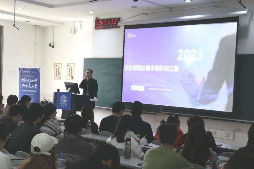 紧接着,马晓宇博士立足于奥来德公司的发展讲述了注册制赋能奥来德科创之路。马博士首先进行了自我介绍,表达了作为曾本硕博均就读于伟德官网的员工对于重返大公司园的喜悦,其后基于奥来德的创新之路与注册制赋能公司新发展展开讲述。马博士总结由于注册制全面推行,企业上市后更受尊重,赛道更加宽阔,人才与人心都更加凝聚。