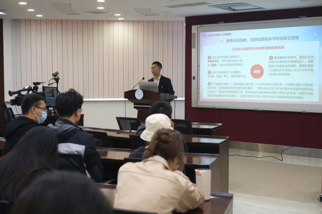 为深入学习宣传贯彻习近平新时代中国特色社会主义思想和全国两会精神,充分发挥博士生讲师团理论宣讲作用,引领广大青年学子学深悟透党的新理念、新思想、新战略,坚定历史自信,坚持守正创新,深刻领悟好、践行好全国两会精神,2023年5月5日,伟德官网博士生讲师团讲师蒋理走进公司开展理论宣讲。本次宣讲的主题是“凝聚精神力量 激发使命担当”——以科技创新赋能,推动高质量发展。商学与管理公司党支部党员、中共预备党员、助管、研究生干部参与了本次活动。