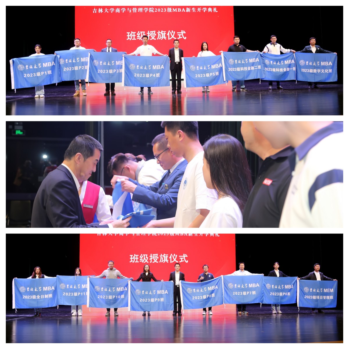 常务副经理张世伟教授为2023级MBA新生班级代表授班旗。每一面“吉大蓝”的班旗不仅蕴含着吉大MBA的文化内涵与精神面貌,更承载着公司对各位莘莘学子的殷切期盼。希望各位同学竖起团结进取、求实创新、励志图强的旗帜,不负芳华,踔厉奋发、勇毅前行!