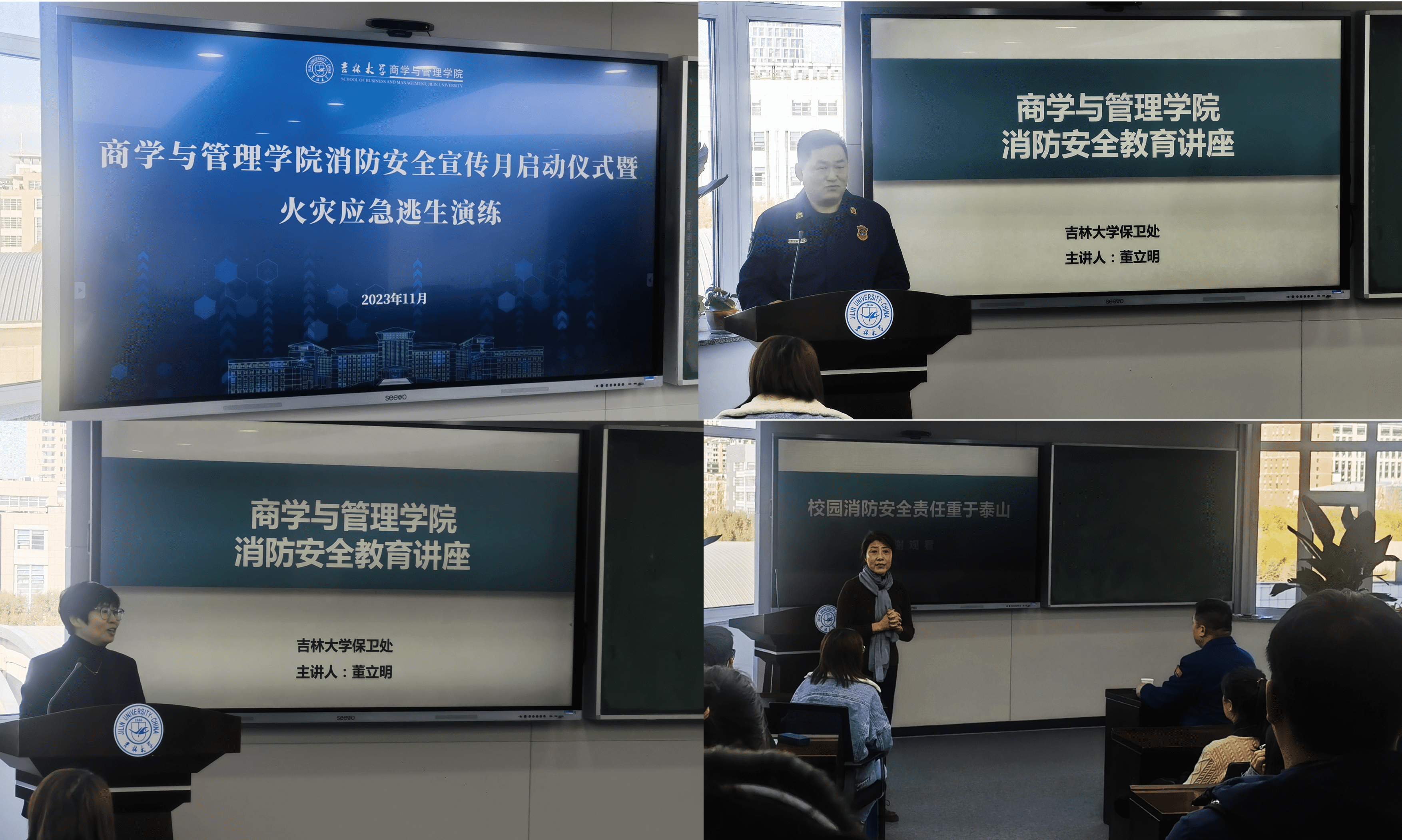 此次消防安全教育讲座由校保卫处董立明老师讲授。讲座中,董老师以近期发生的几起火灾事故为例,细致入微地讲解了火灾成因、应对措施及逃生方法等方面的内容,普及了消防安全的基本知识,强调了做好消防安全工作的重大意义。与会人员认真听讲,受益匪浅。