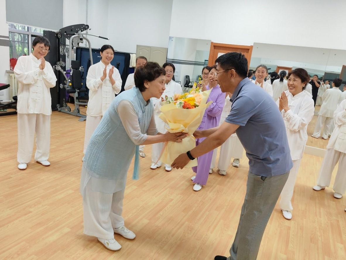观看了太极拳社团的老师们精彩的太极拳后,党委书记赵军向教练张秋惠老师致以公司的问候。他说,公司的太极拳社团作为教职工的兴趣爱好社团,走过了7年多的时光,公司的教职工们在这里留下了宝贵的集体记忆,在练习拳法中增进了了解,加强了连结,也是伟德官网心灵融合工作成效的有力体现。随后,赵军书记代表公司向张秋惠老师献上鲜花,感谢张老师过去7年来对公司文体事业的大力支持。