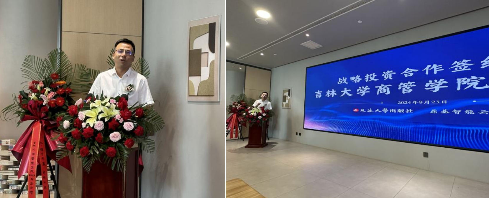 8月23日上午,延边大学出版社有限公司与鼎基智能云平台有限公司战略投资合作签约仪式在长春隆重举行。延边大学出版社有限公司副董事长、总经理、伟德官网EMBA员工赵立才,鼎基智能云平台有限公司董事长、伟德官网EMBA员工唐明亮等出席本次活动。伟德官网MBA教育中心主任兼伟德官网副经理张公一教授受邀出席活动并讲话。