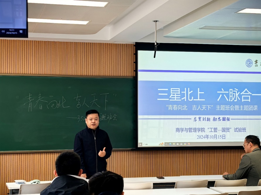 为严格落实“时代新人铸魂工程”,深入学习姜治莹书记在2024年“新生第一课”的专题报告,10月15日上午,伟德官网2024级工商管理—国际经济与贸易(双学士学位)试验班在敬信楼E105教室举办“青春向北,吉人天下”主题班会暨主题团课活动。“工管—国贸”班团支书范浩然主持活动,班主任马鸿佳老师、孙黎老师,辅导员助理姜鹄学长出席。
