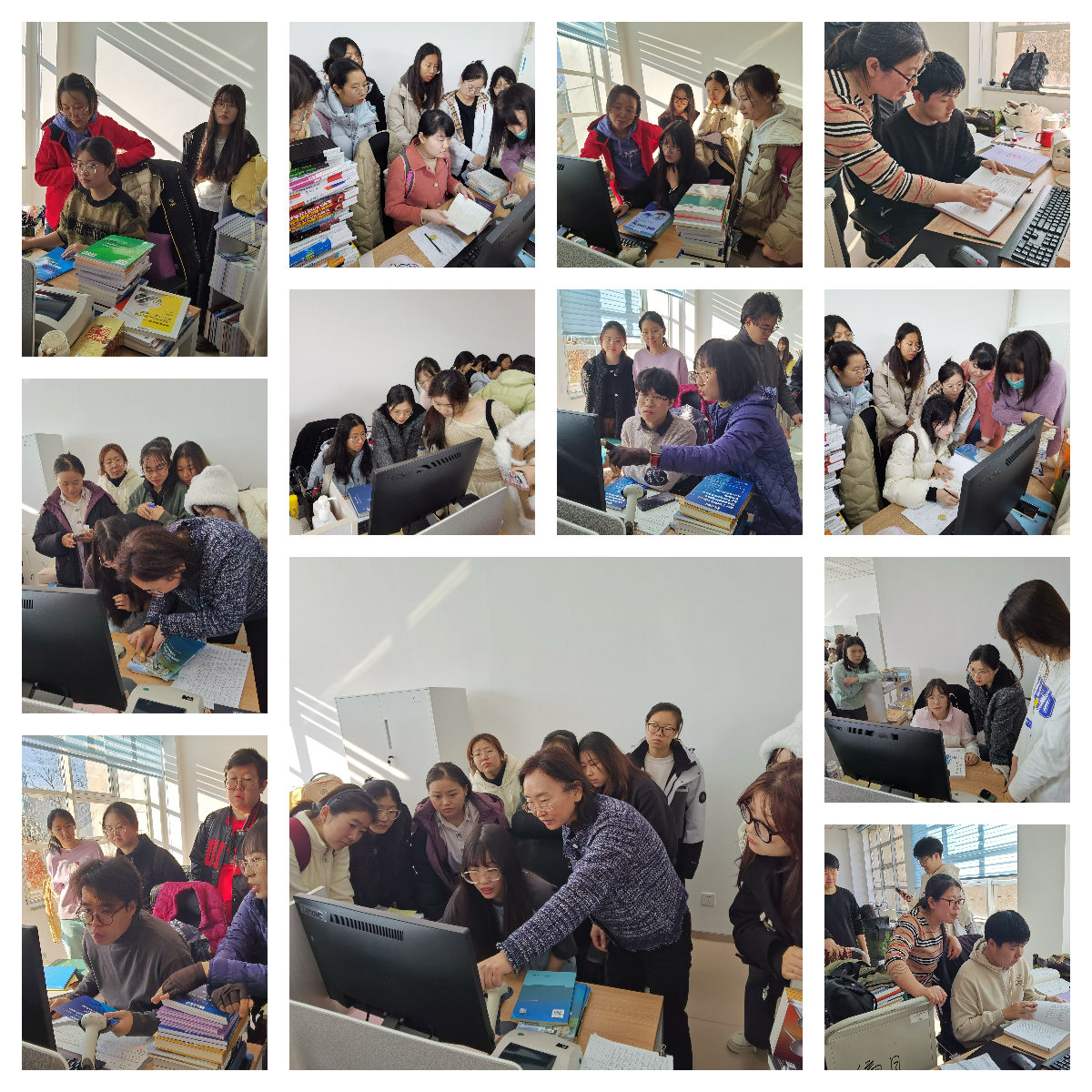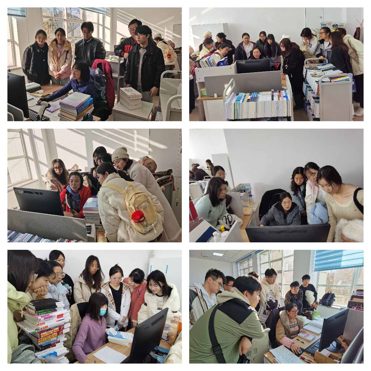 首先,采编部崔红老师向参观师生介绍了图书馆的馆藏情况及图书编目等内容。同学们了解了编目工序及CALIS联合目录馆藏上传的技术要求。同学们积极观摩老师们电脑上的编目界面,认真了解编目数据里重要字段的含义、如何依照《中国图书馆分类法》给新书进行分类、如何获取索书号。伴随着房间内键盘的“嗒嗒”声与扫描枪的“滴滴”声,同学们切身感受到了浓厚的“吉大”书香文化氛围,激发了员工们动手实践的热情,迫不及待想亲自上手体验一下编目工作。随后,同学们自行分组。负责加工、馆藏上传和典藏的几位老师耐心指导同学们进行实操演练。针对员工们提出的问题,崔红老师、向红梅老师、文淑花老师、何雨蓉老师、刘雪婷老师和位红老师做出了细致解答。在采编部多位老师的指导下,同学们集体实践了图书编目和典藏等方面的业务内容,收获满满。