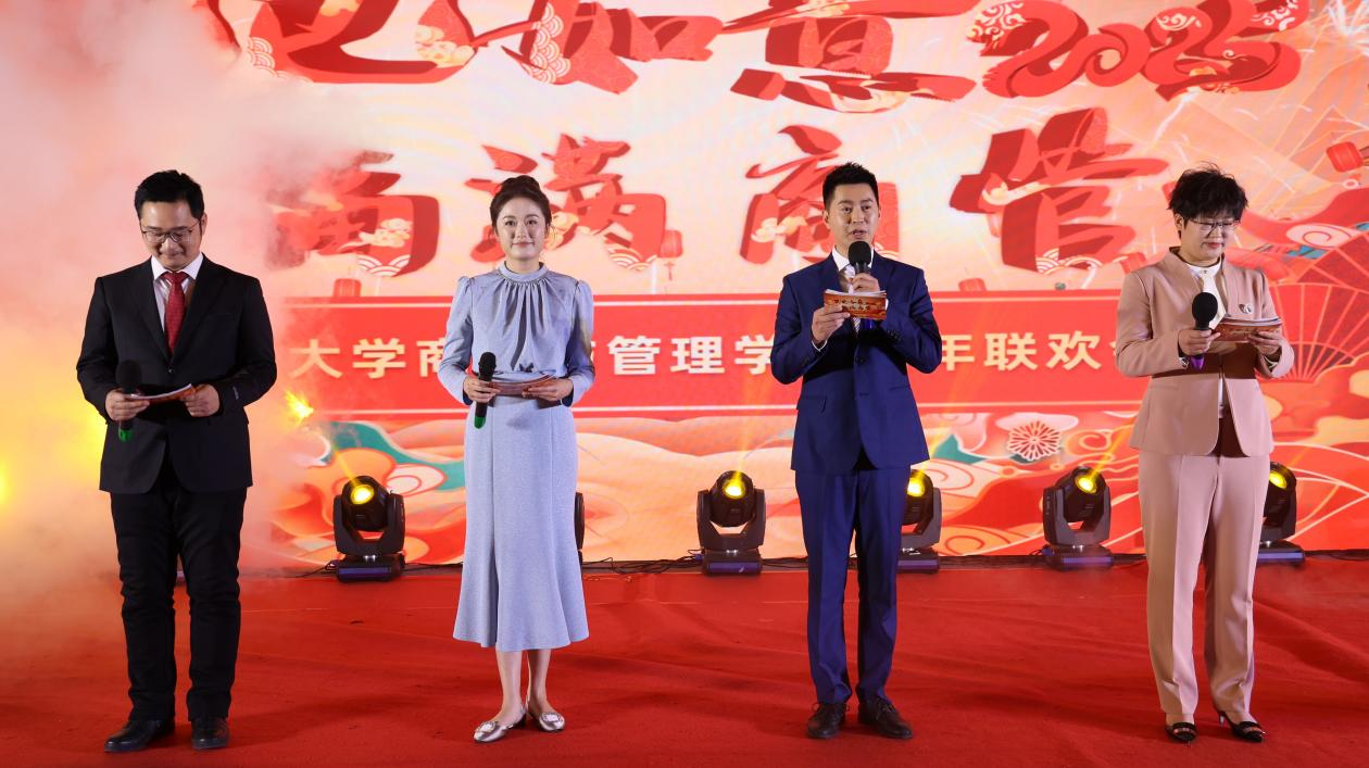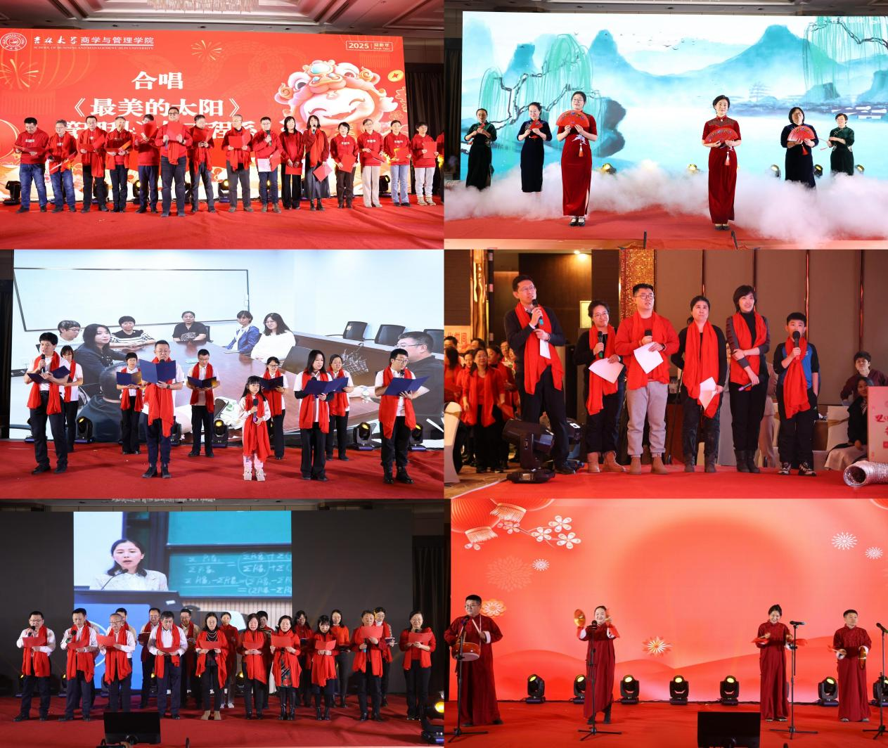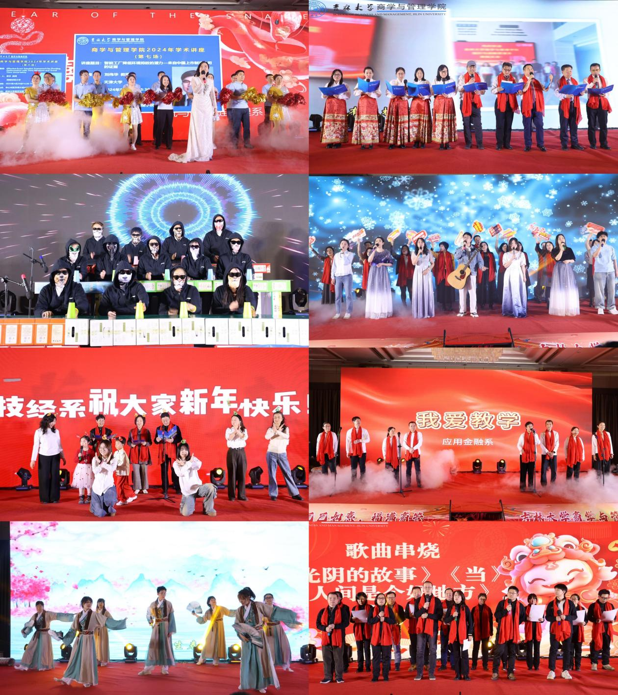 物流与供应链管理系全体教师用歌舞《喜乐年华》以欢快的节奏和喜庆的氛围,拉开了联欢会的序幕,展现了商管人迎接新春的喜悦与对美好未来的期盼。紧接着,组织与战略管理系的全体教师通过经典《校园歌曲串烧》,带领全场回顾了美好的校园时光,重温那些经典的旋律,感受着那份纯真的情感。市场营销系老师们带来的杯子舞《不是悲剧是杯剧,一场激昂雄壮的杯剧》则以独特的创意和激昂的节奏,演绎了一场别开生面的视听盛宴。信息管理系全体教师唱响《夜空中最亮的星》,从《明天你好》展望《明天会更好》,用歌声串联起对未来的美好祝愿,生动展现了全体商管人在过去一年中的守望相助,奋楫笃行,以及对未来的豪情满怀、美好展望。技术经济系全体教师的大合唱《敬业工作联盟》以激昂的歌声展现了商管人的敬业精神与责任担当。白山黑水,先生向北,迎难而上,踔厉奋发,我们将跟随党的步伐,扎根东北,无私奉献,学史鉴今守初心,阔步启航新征程。应用金融系全体教师的朗诵《我爱教学》诉说了商管老师们对教育事业的热爱与执着,金句频出,惊艳全场。国际商务系教师们以情景歌舞的形式,带来《上春山》,以生动的表演和优美的舞姿,描绘了春天的生机与希望,表达了老师们对商管公司蓬勃发展的美好祝愿。会计系全体教师的歌曲串烧《光阴的故事》《当》《人间是个好地方》则用歌声诉说着人间真情与美好,让人感受到生活的温暖与甜蜜。管理科学与工程系全体教师齐唱《最美的太阳》,老师们倾情投入,豪情万丈,传递出商管人对美好未来的向往与追求。人力资源管理系的全体教师带来了一支创新的舞蹈走秀《万水千山总是情》,点燃全场,展现了公司师生间的深厚情谊。财务管理系教师们带来的《歌曲联唱》将多首经典歌曲串联起来,展现了老师们多才多艺的一面和积极向上的精神风貌。工程管理与项目管理系全体教师则带来了一场精彩绝伦的配音秀《成长的烦恼》,使大家身临其境,感受了一场成长的烦恼和欢笑。数量经济系全体教师深情演绎《这世界那么多人》,悠长生命的晨昏中,感恩各自的遇见,美好的时光将留在梦田,永不散场。最后,由公司机关代表们带来了三句半表演,以幽默诙谐的方式,回顾了商管人在过去一年收获的累累硕果,为联欢会画上了圆满的句号。