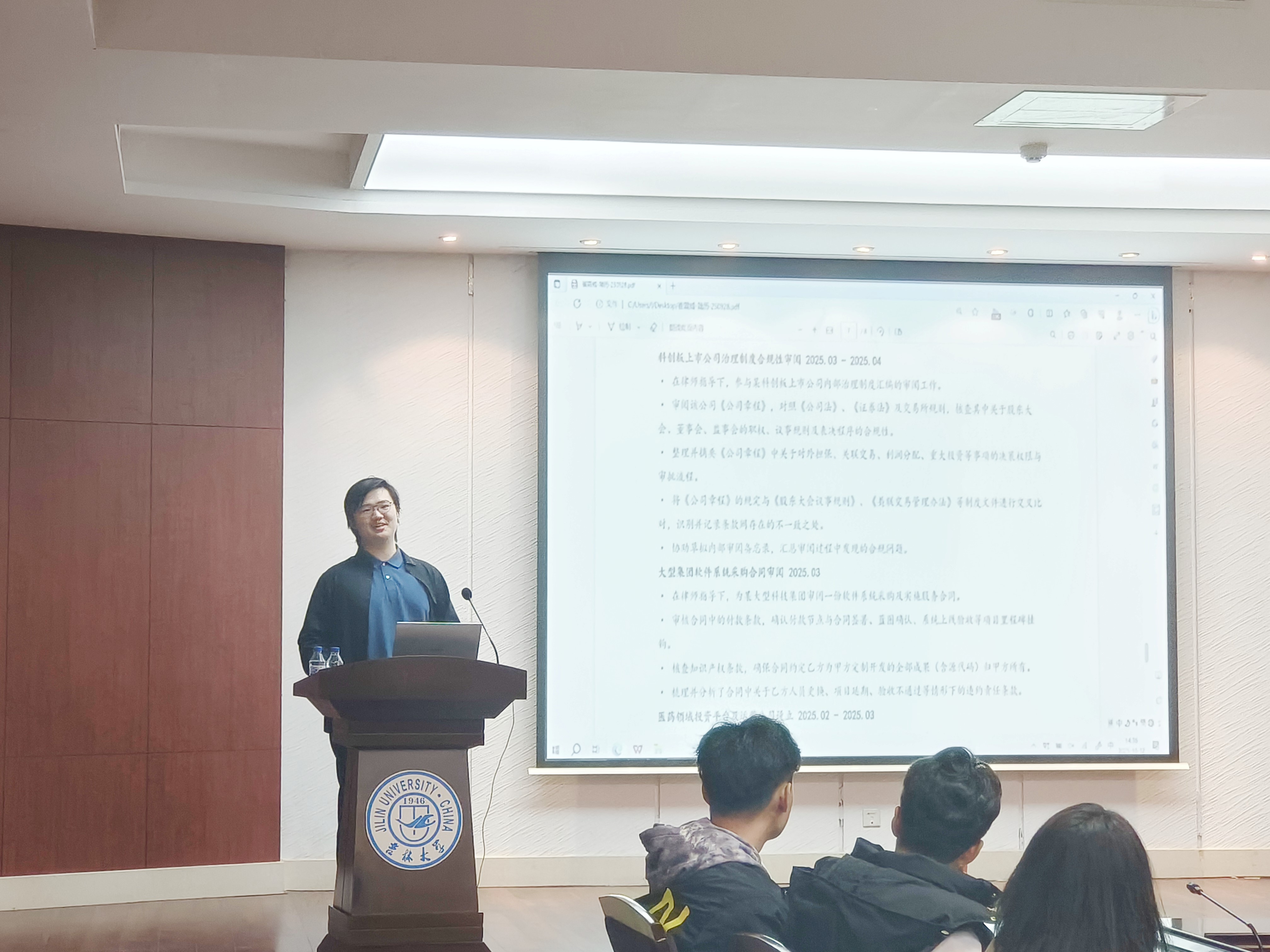 报告伊始,马捷副经理为大家介绍王勇老师,并代表公司对王老师的到来表示热烈的欢迎。随后,王勇老师结合个人职业发展历程,围绕大学求学、公务员、律师及教育创业者四个阶段展开分享,系统阐述了在商法融合背景下的实践思考与成长感悟。他从工作与学习双重视角出发,为在场同学们提出以下核心建议:在专业学习上,应拓宽知识边界,注重培养自学能力与主动担当的精神;在学习方法上,王老师将学习概括为十字经验,即“读书、思考、交流、实践、自学”,强调学习应超越应试,实现内化于心、外化于行;在职业规划上,王老师倡导“将个人内驱力与社会普遍需求相结合”,理性选择行业赛道,应不断向内探索,明晰真实需求,以内在动力驱动行为选择,持续学习与思考;在人生决策上,应以未来期望为导向,避免陷入线性思维的陷阱;在认知构建上,王老师强调个人认知的突破有赖于持续且主动的自我训练,员工应有意识地与高认知人士交流、刻意练习写作能力,在思想碰撞中汲取智慧,通过系统性的文字输出梳理思想。