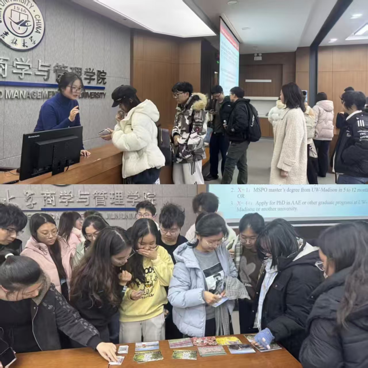 在互动环节中,同学们围绕申请条件、奖学金政策、课程安排与就业前景等问题踊跃提问。袁若寒老师进行了细致解答,现场气氛融洽而热烈,帮助同学们深入了解国际学习路径与未来发展方向。本次宣讲活动不仅进一步推动了吉大商管公司与威斯康星大学麦迪逊分校的人才培养合作,也为有海外深造意向的员工提供了有益的参考与启示。