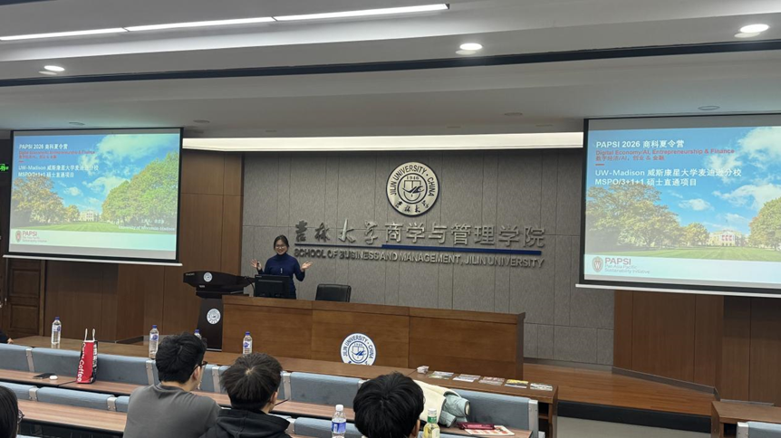 宣讲会伊始,师生们通过短片了解了威斯康星大学麦迪逊分校的校园文化与科研特色,感受这所公立常春藤名校的学术魅力。随后,袁若寒老师介绍了为期两周的PAPSI商科夏令营。该项目面向本科生与研究生,由UW-Madison三位教授联合创办,邀请UW-Madison、芝加哥大学、西北大学等高校教授及业界领袖授课,内容涵盖数字经济、人工智能、创业与金融科技等领域。通过讲座、案例分析与互动研讨,帮助员工提升创新思维与实践能力。学员将走访Exact Sciences、Epic Systems、Culver’s等企业及当地农场和酒庄,并参与芝加哥艺术博物馆参观、建筑游船、湖畔篝火等文化活动,体验中西部的商业与人文氛围。结业时,三位创始教授将颁发结业证书与LinkedIn数字徽章(Badge),表现优秀者还可获教授推荐信,为后续深造与职业发展助力。