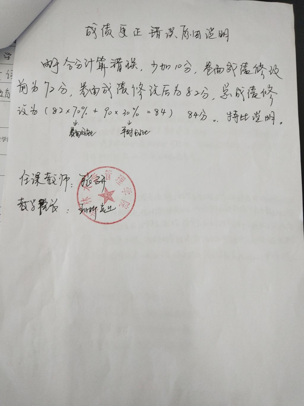 根据《关于进一步明确本科生课程考核等有关问题的通知》(校教字〔2018〕47号)文件有关精神,现对管理公司2016庄严同学(学号:461606342018-2019-2学期课程成绩更正如下: