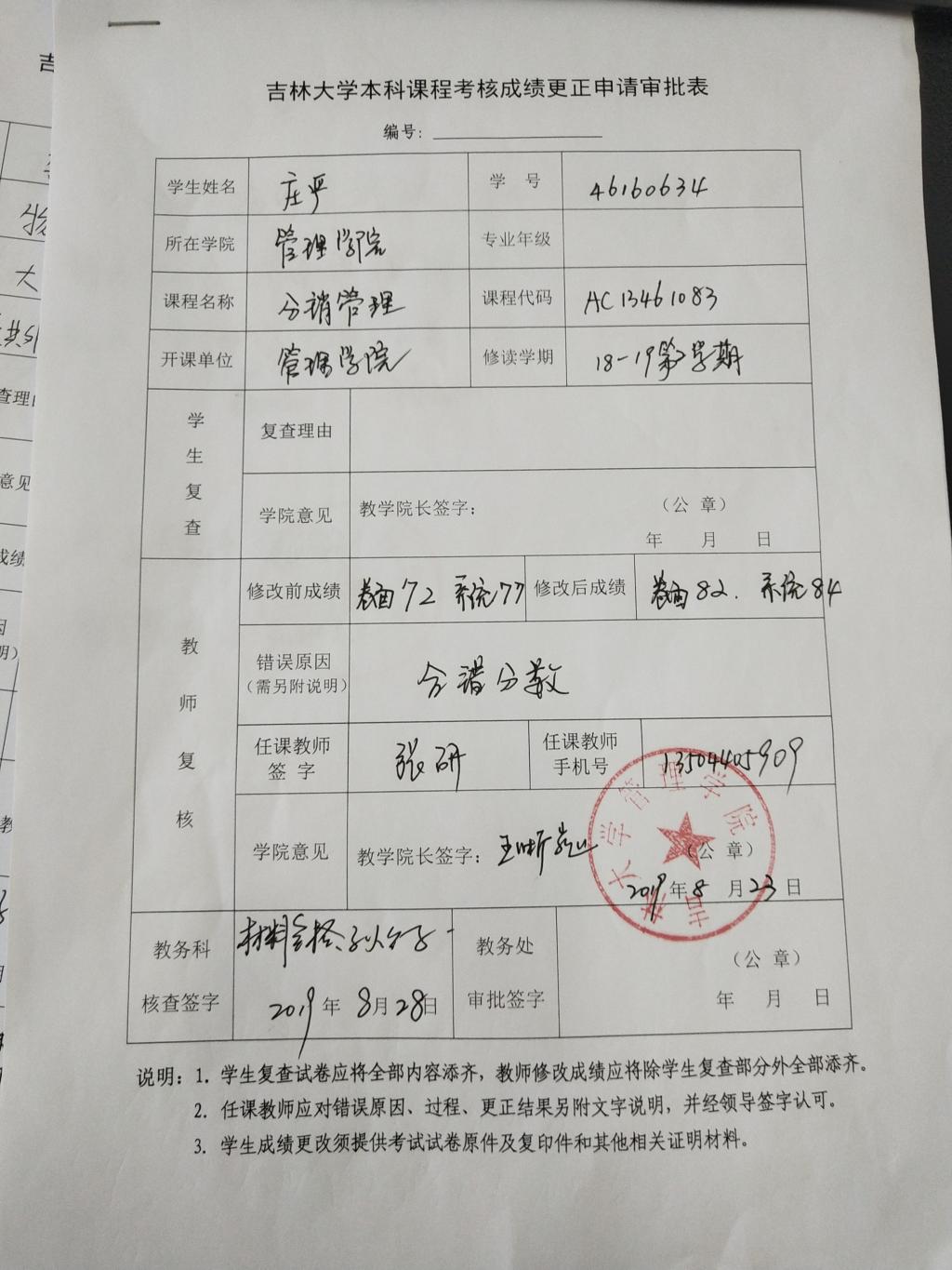 关于管理公司2016级庄严同学分销管理课程成绩更正的公示