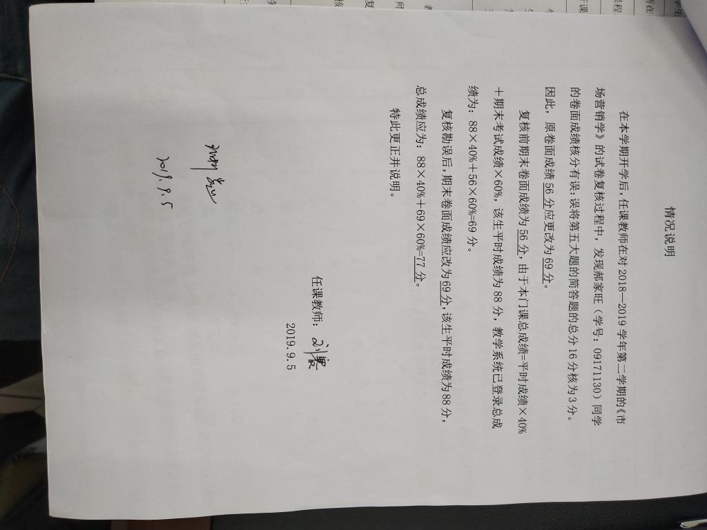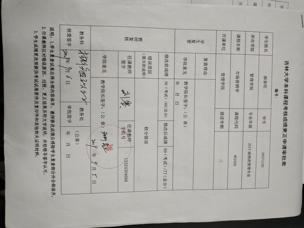 关于管理公司2017级郝家旺同学市场营销学课程成绩更正的公示