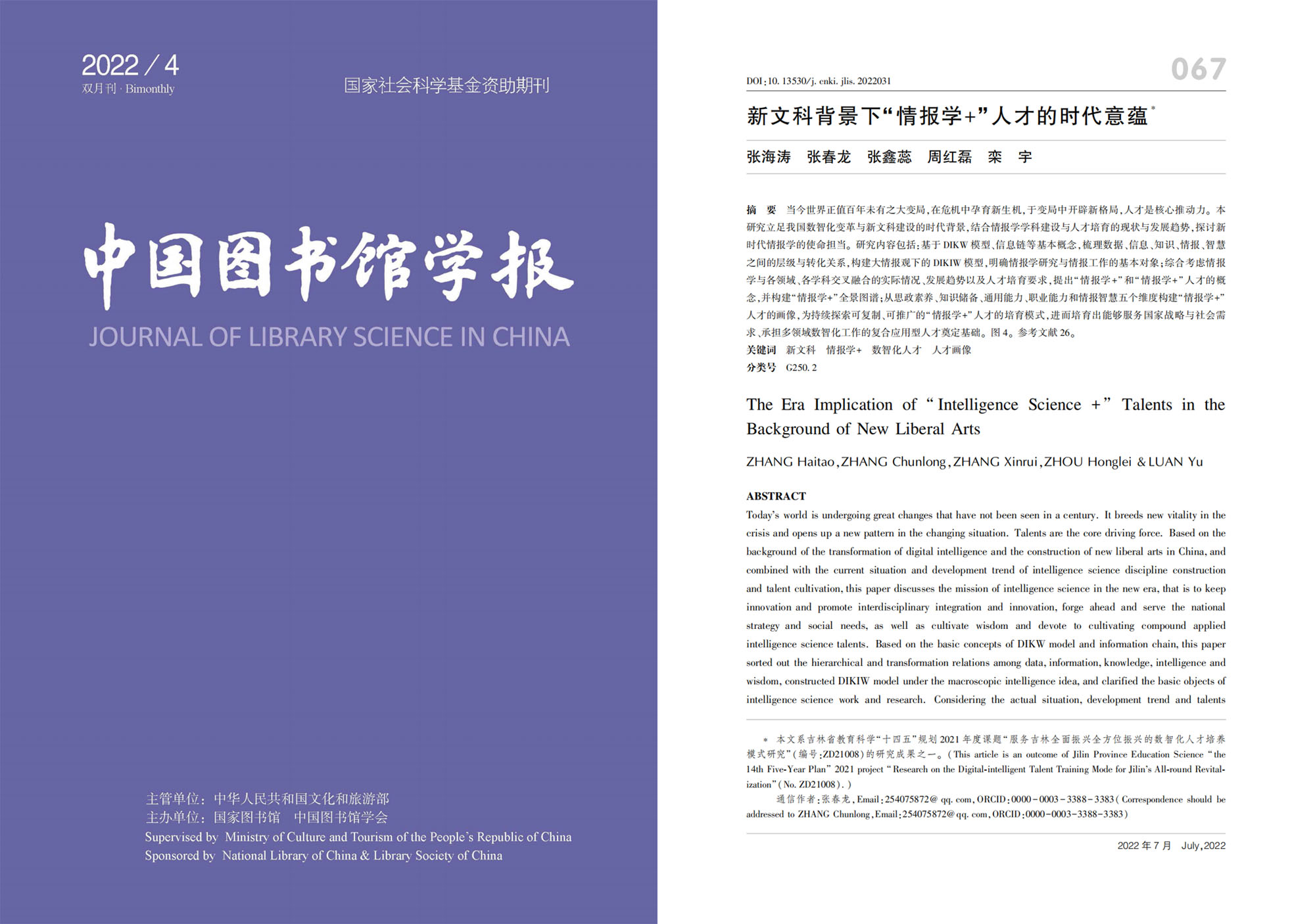 伟德官网、信息资源研究中心主任、“情报学+”研究生学科交叉融合学术交流中心负责人张海涛教授等在《中国图书馆学报》2022年第4期发表题为《新文科背景下“情报学+”人才的时代意蕴》文章。该文章立足我国数智化变革与新文科建设的时代背景,探讨了新时代情报学的使命担当,并解读了“情报学+”与“情报学+”人才的时代意蕴。