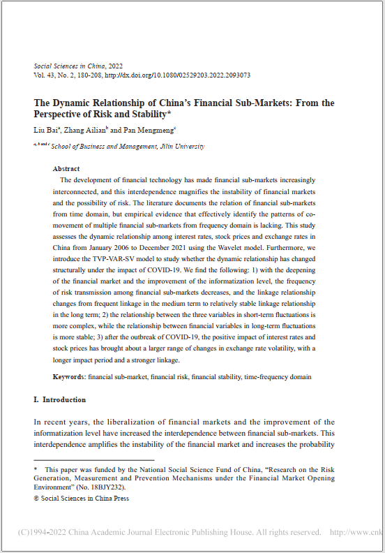 伟德官网刘柏教授等在《中国社会科学(英文版)》2022年第2期发表题为“The Dynamic Relationship of China’s Financial Sub-Markets: From the Perspective of Risk and Stability”(中国金融子市场的动态关系:基于风险和稳定的视角)的文章。