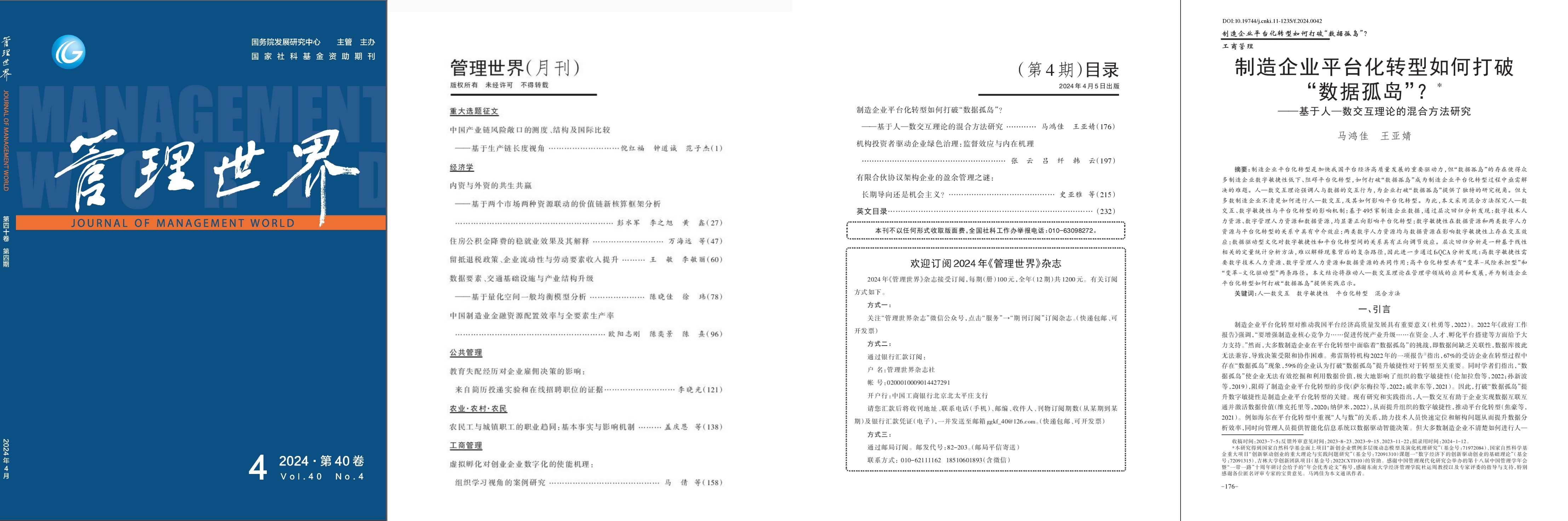 伟德官网马鸿佳教授等在《管理世界》2024年第4期发表题为《制造企业平台化转型如何打破“数据孤岛”?——基于人—数交互理论的混合方法研究》的文章。该文紧扣数字经济时代下如何打破“数据孤岛”发挥数据价值这一关键问题,基于人-数交互理论,创新性地采用混合方法,揭示了制造企业平台化转型路径。