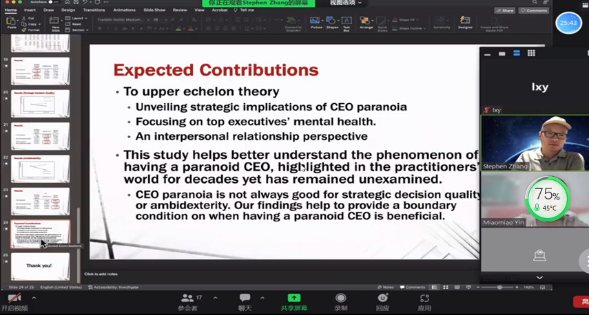 Stephen Zhang教授汇报结束后,与参会老师和同学们就数据收集及分析,数据结果解释以及心理学研究视角等问题与张教授进行了深入的探讨。随后,本次讲座成功落下帷幕。通过与国际知名创业研究学者Stephen Zhang教授的学术交流,对伟德官网的教师和员工在拓宽研究思路、加强论文写作等方面起到很好的指导作用。参会同学们受益良多,获得了很多启发与感悟。