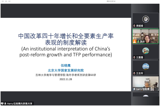 第六十二场讲座主讲嘉宾是北京大学国家发展研究院的伍晓鹰教授。伍教授带来题为“中国改革四十年增长和全要素生产率表现的制度解读”的报告,财务管理系的聂丽副教授主持了本次讲座。
