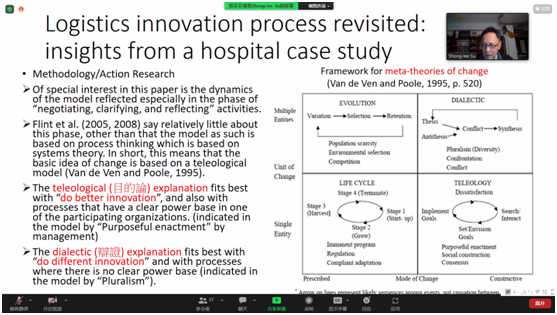苏教授以自己所做的一篇研究Logistics innovation process revisited: insights from a hospital case study为例,详细介绍了该行动研究的起源、与产业合作的契机、开展实践行动的过程、以及与理论对话形成论文的全过程。该研究起源于对在职研究生毕业论文的指导,在两年的实践中,苏老师结合员工所在的医院存在的物流问题进行创新实践,这个过程是以物流创新理论为指导,并在应用中实现了对该理论的发展,最终论文发表在物流与供应链领域的重要期刊上,并获得了当年的最佳论文。