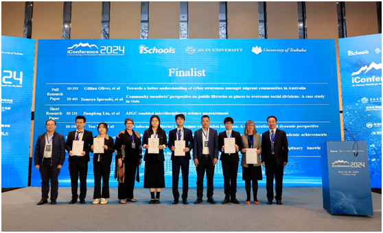 致辞结束后,进入最佳论文颁奖环节。会议评选出最佳长论文一等奖1项,最佳长论文二等奖1项,最佳长论文入围奖3项,最佳短论文一等奖1项,最佳短论文二等奖1项,最佳短论文入围奖3项,最佳中文论文奖1项,最佳中文论文入围奖4项,最佳海报一等奖1项,最佳海报二等奖1项,最佳海报入围奖3项。iConference 2024长论文主席马捷、iConference 2024中文论文主席张洋、iConference 2024短论文主席Masanori Koizumi、iConference 2024大会主席Atsuyuki Morishima与郭英彤分别宣读了获奖名单。