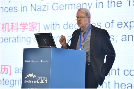 在主旨报告环节,Michael Seadle发表了题为“Information Science: History, Ideas, Applications”的演讲。他指出,信息科学是一种跨越边界的思维方式,不仅涉及特定信息的选择和组织,还涉及信息的处理、使用、存储和收集等多个方面。Michael Seadle展示了全面而深入的信息科学图景,强调信息科学在当今社会的重要性与广泛的应用前景。