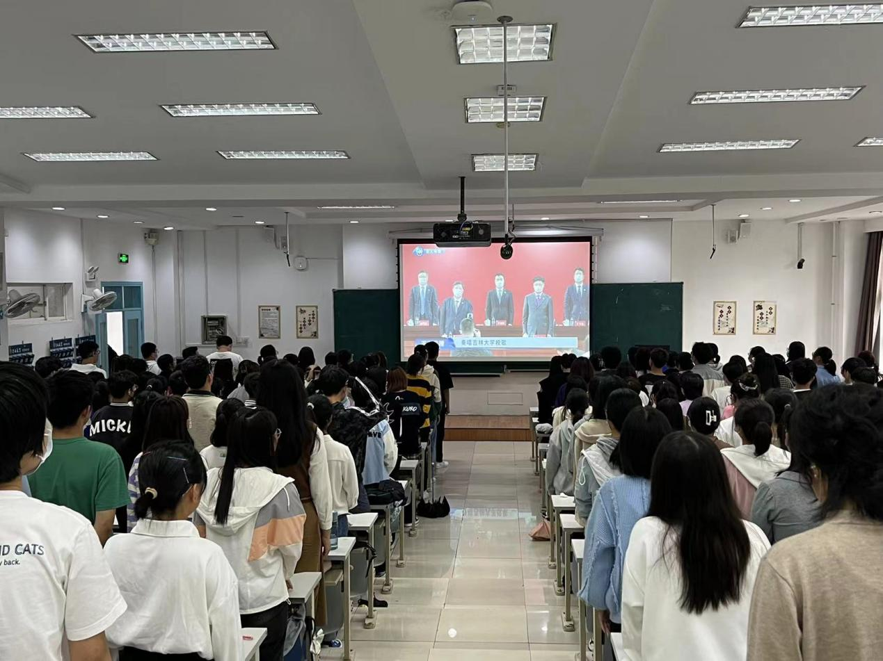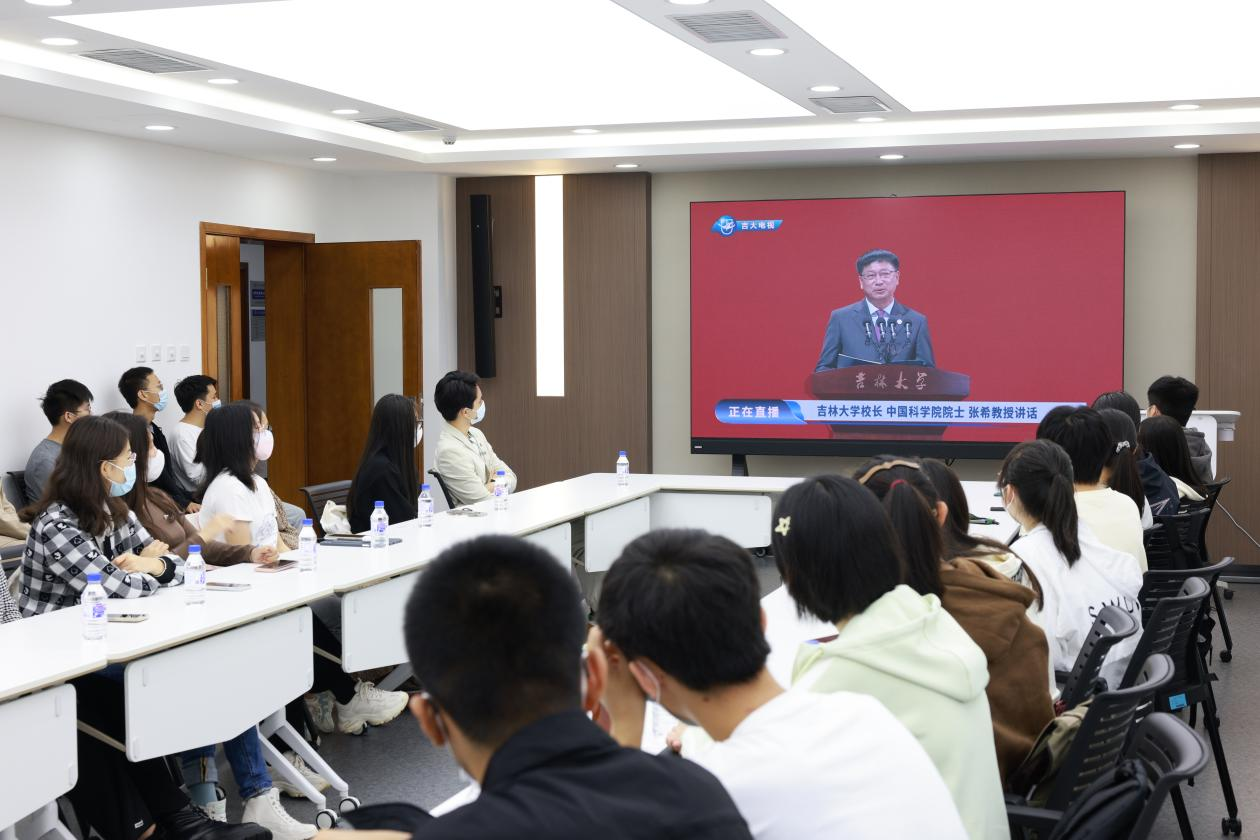 2022年9月15日上午八点三十分,2022年开学典礼在中心校区宋治平体育馆举行。伟德官网积极响应公司要求,在中心校区布置四个分会场,在严格遵守长春市及伟德官网近期疫情防控要求的前提下,组织公司全体新生在线观看2022年开学典礼。商学与管理公司党委书记赵军、商学与管理公司党委副书记兼副经理李帅与同学们共同观看。