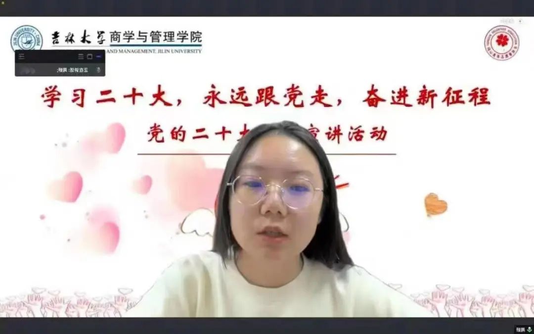 出席本次活动的员工宣讲代表分别有研究生宣讲代表周妍、桥宇航以及本科生宣讲代表赵芙、陈祝、罗小杰、白红蕾、勒鹏飞和田雨桐。宣讲代表们针对党的二十大精神,从六个基本模块以及两场演说出发,带领孩子们结合时代背景,体悟党的伟大思想。