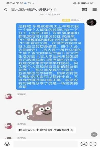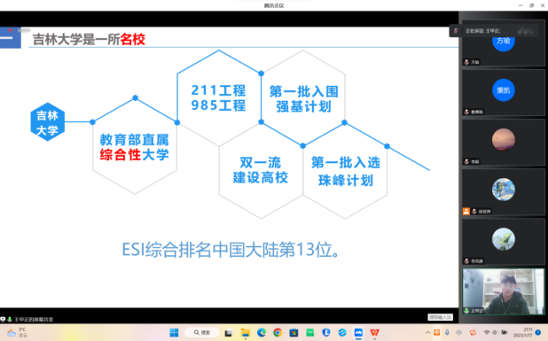 1月17日晚21:10——21:40,“沂起来吉大队”四人在临沂商城实验公司宣讲分会场2分别从吉大是一所什么样的大学、在吉大的学习生活、在吉大的日常生活以及吉大学子未来的发展四个方面展开宣讲,并热情地讲述了自己高三学习的经验,为学弟学妹提供学习、报考新思路,反响热烈,互动激烈。因宣讲公司众多,临沂商城实验公司使用了腾讯会议云录制功能并将其分享至高三班级群内,方便同学与家长随时观看回放,提升了宣传力度。至此,本次宣讲活动圆满结束。