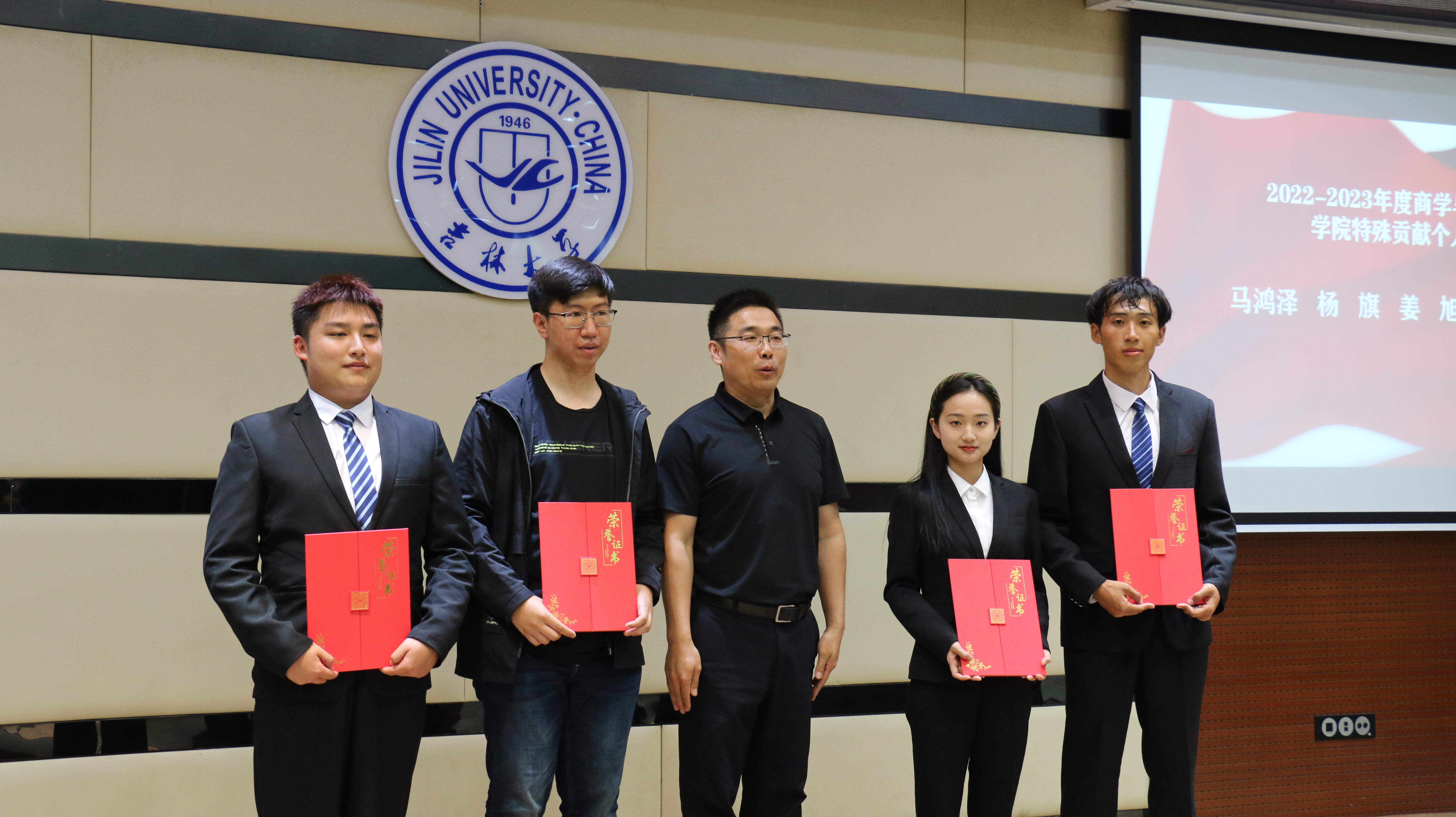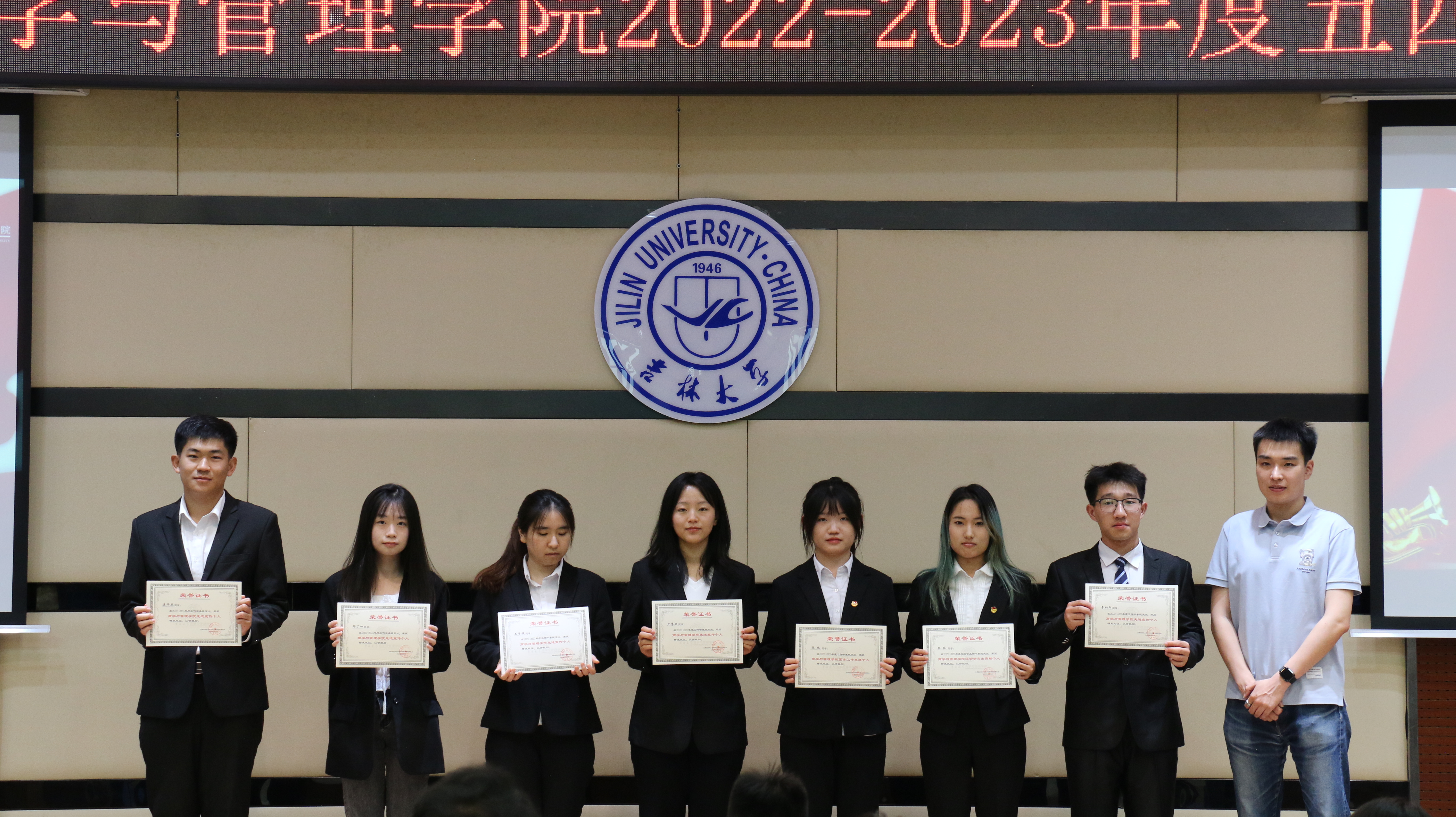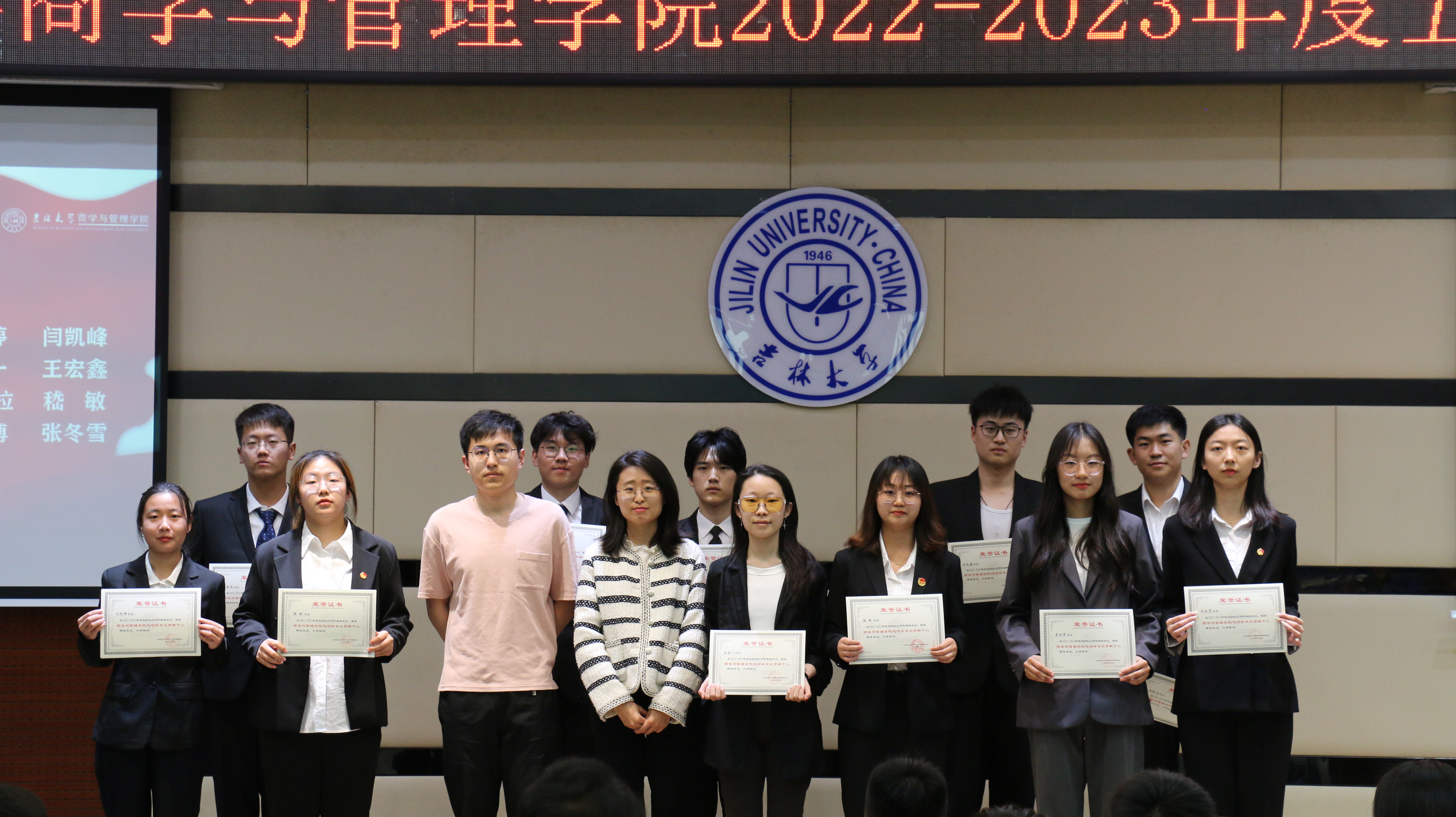 大会第四项,由员工办公室主任兼2021级辅导员丁越老师宣读表彰决定,他特别肯定了同学们的辛勤付出,为各位获奖的同学送去鼓励与祝福,并希望他们能再接再厉,助公司团学工作更上一步台阶。大会第五项,主持人宣读获奖员工名单,各位老师依次上台,亲自为表彰员工们颁发证书。同学们怀着愉悦的心情踏上颁奖台,与颁奖老师一起合影留念,每个荣誉的瞬间,都被永远定格在公司的记忆之中。