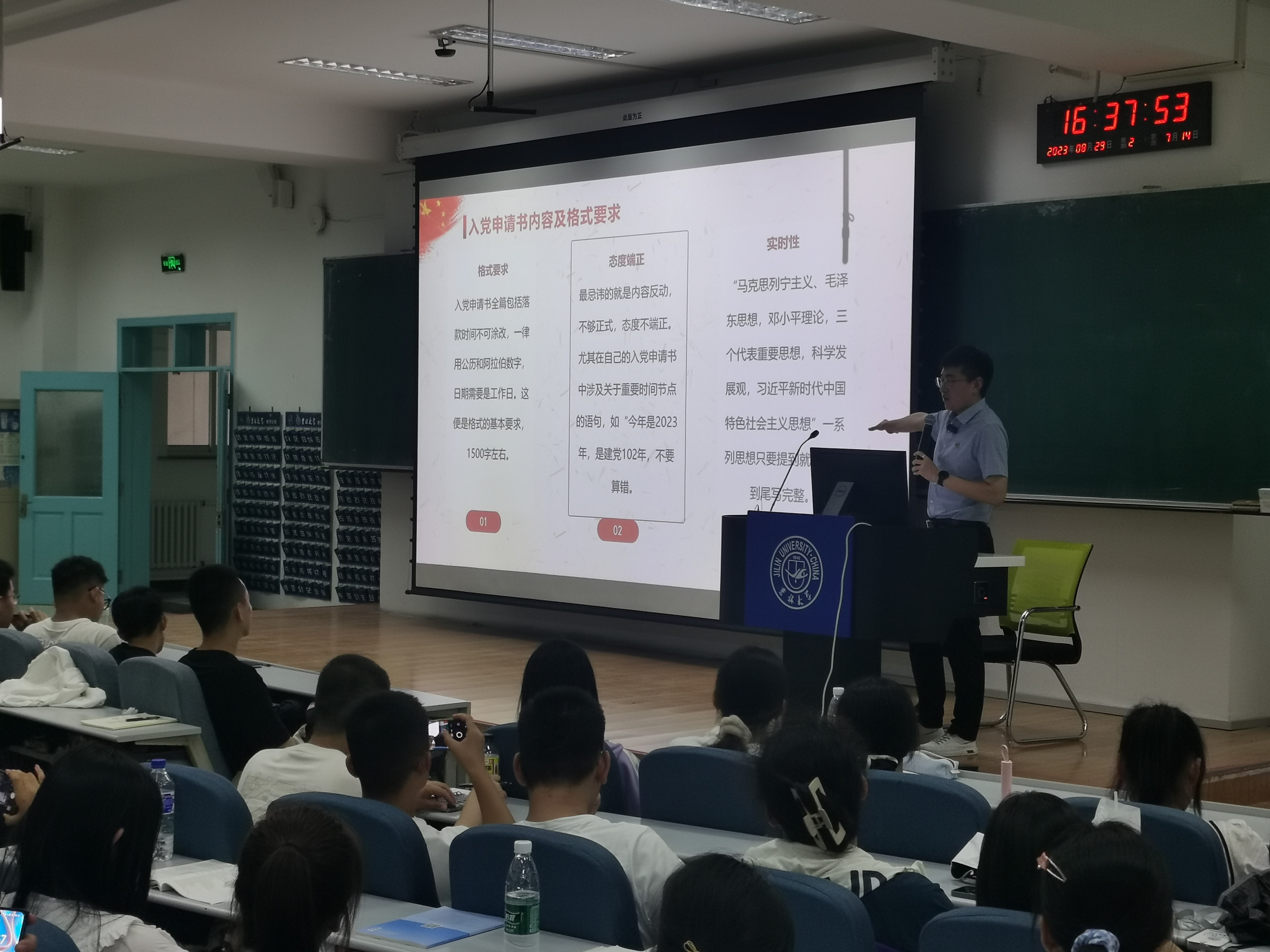 为培养新生爱国爱党信念,引领青年学子向党组织靠拢,积极拥护和执行党的路线和方针。2023年8月29日下午四点,伟德官网新生入党启蒙教育会议在第三教学楼第一阶梯教室开展。本科生第八党支部书记禚传阳老师作为主讲人出席会议。公司2023级本科生全体参与会议。