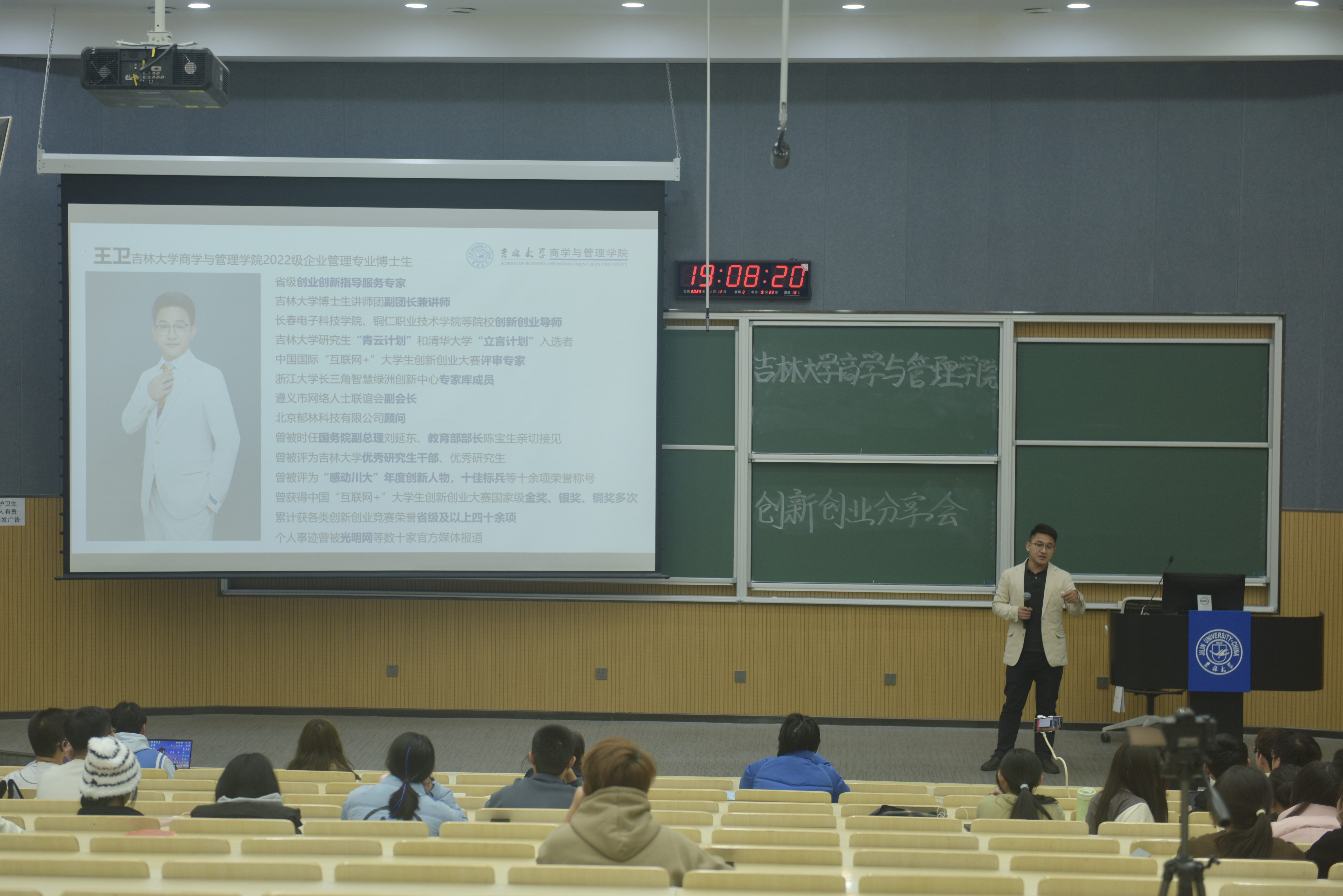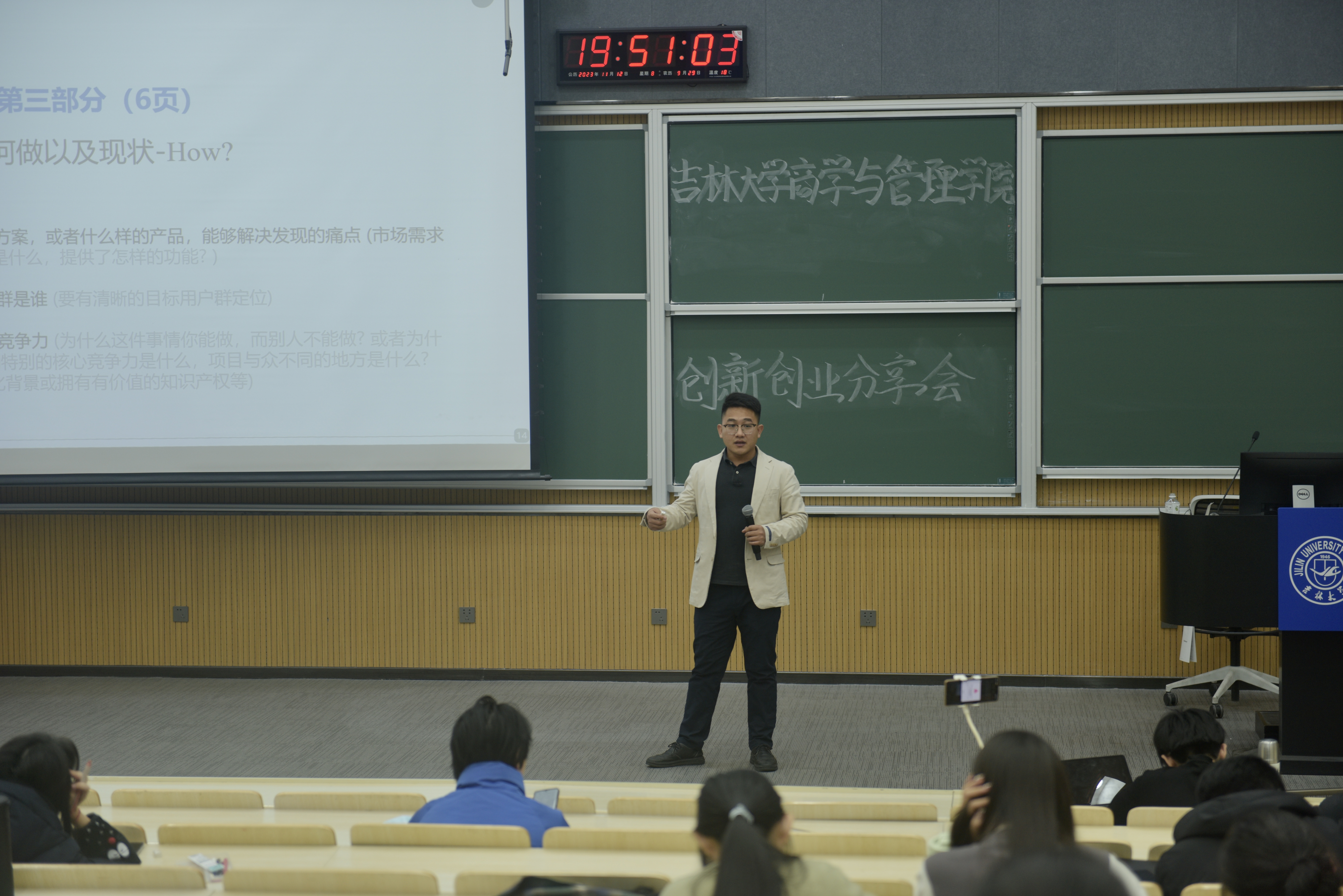 随后王卫师兄强调了高质量路演的重要性,并分享了“Road Show(路演)三大招”——演练、演练,再演练,直到演讲人对路演的演讲稿熟记于心,能够做到脱口而出。为了让同学们更直观地感受到路演的正式性,王卫师兄现场进行了完整的路演展示,慷慨激昂的情绪感染了在座的同学们。在路演中,王卫师兄分享了自己一路从贵州山村走出大山到全国各个地方发展的成长历程,大学时期的艰苦创业经历为他日后的成功打下了坚实的基础。