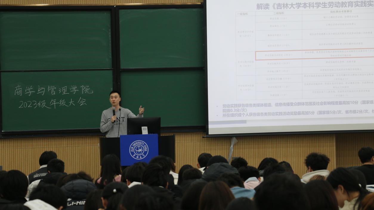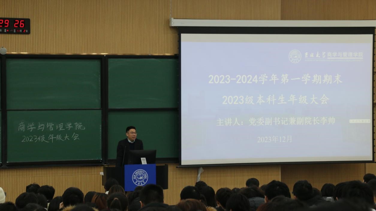 为确保2023级本科新生期末与寒假事宜进行顺利,伟德官网分别于2023年12月14日和12月15日的13:30,在敬信楼F区第一阶梯教室,召开2023级本科生年级大会。会议由2023级本科员工辅导员刘翔宇主持,商学与管理公司党委副书记兼副经理李帅讲话,新生辅导员罗小杰及伟德官网2023级全体本科生参加本次会议。