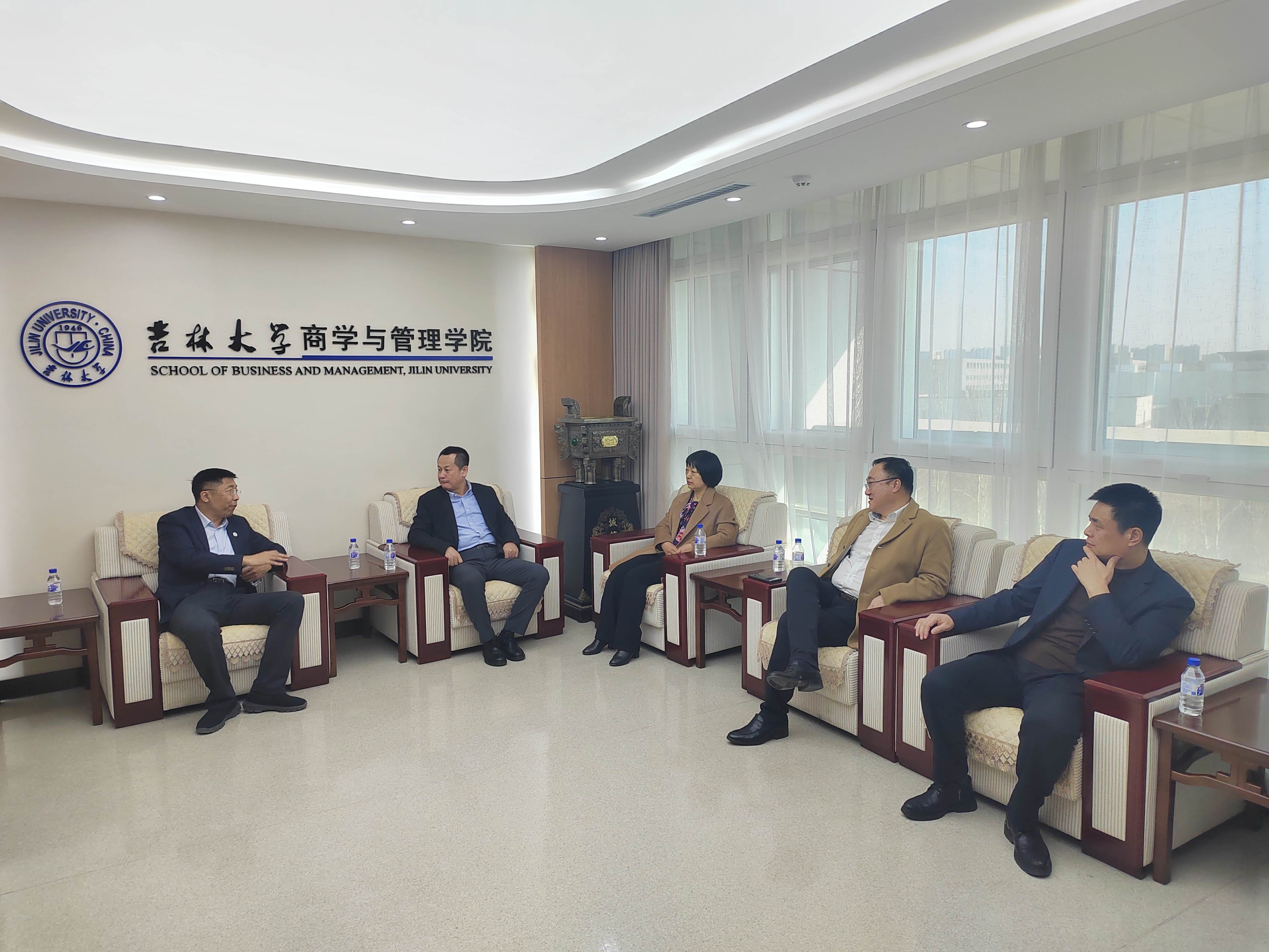 仪式开始之前,商学与管理公司党委书记赵军会见了中国人民银行吉林省分行宣传群工作部部长朱慧玲、中国农业银行长春分行党委副书记、副行长李韩鹏、中国农业银行长春分行党委委员、副行长兼长春曙光支行党委书记、行长张鹏、中国农业银行长春高新支行党委书记、行长衡阳一行人员,并就校企合作,拓岗就业,推动高校毕业生高质量就业进行了座谈交流。