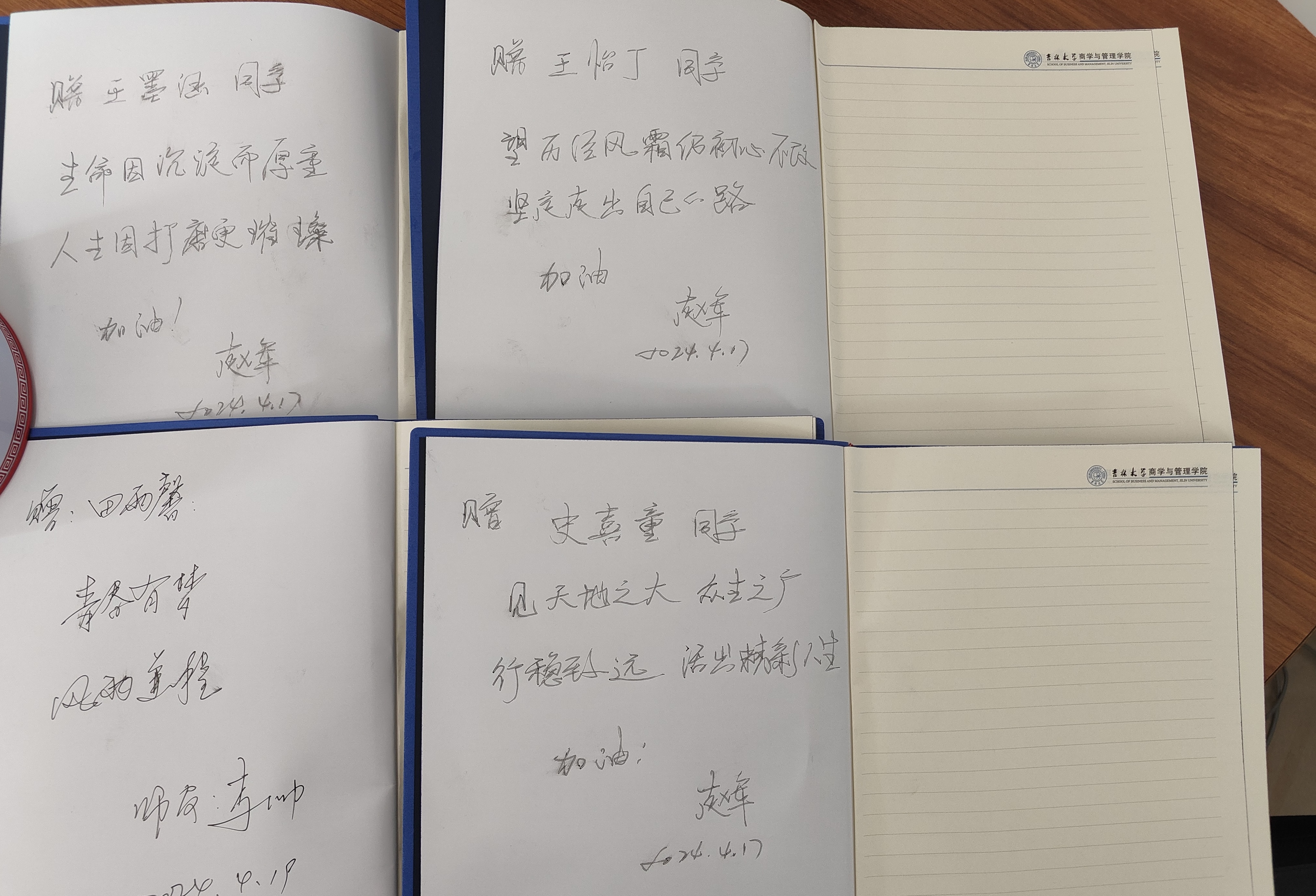 随后,李帅老师和罗小杰老师亲自为转出同学递送了印有伟德官网标识的笔记本,李帅老师说到,这份来自伟德官网的纪念礼物送给大家,希望同学们铭记在伟德官网的一年精彩生活,大家永远是伟德官网的一份子,老师们也永远会为大家保驾护航,话语间充分流露出对同学们的关怀之情。更为细心的是,在每一本给予同学们的笔记本上,都有来自公司党委书记赵军老师、李帅老师、陈卓老师和罗小杰老师写下的对转出同学的殷切希望和衷心祝福。