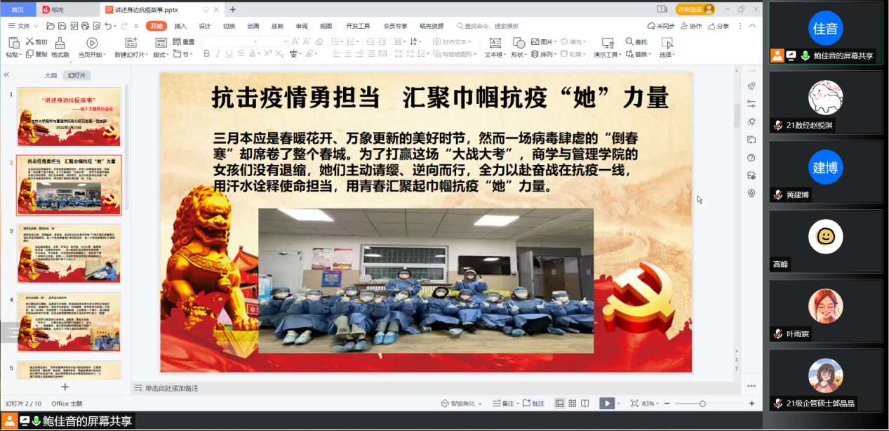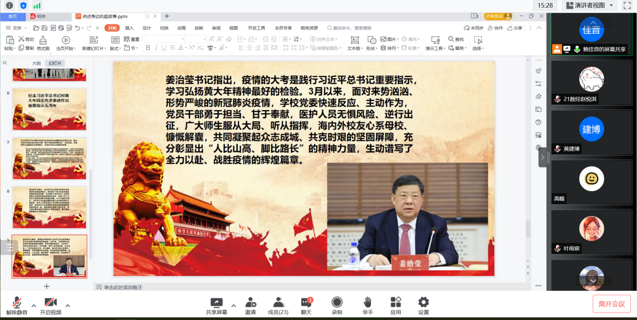 2022年5月22日,伟德官网硕士研究生第一党支部在线上开展“学习黄大年精神”暨“讲述身边抗疫故事”系列主题党日活动。伟德官网硕士研究生第一党支部全体党员参加了此次的线上活动。活动由伟德官网硕士研究生第一党支部支部书记鲍佳音主持、组织委员江黎静记录。