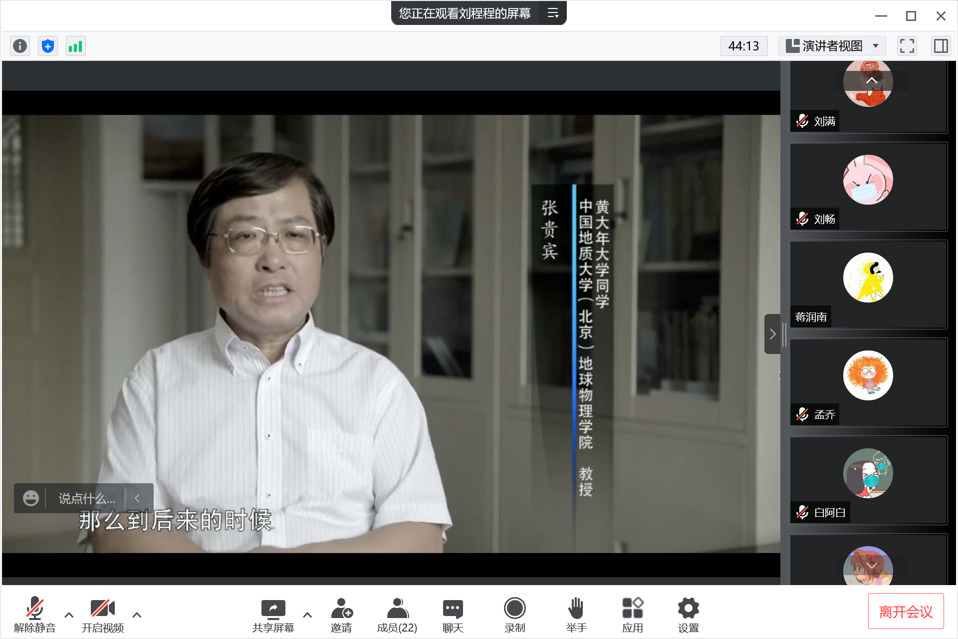 “纪念习总书记对黄大年同志先进事迹作出重要指示五周年”线上座谈开始,支部书记对黄大年同志的先进事迹进行了介绍,对黄大年精神的内容进行了讲述,并强调“心有大我,至诚报国”的爱国情怀是黄大年精神的本质特征,“教书育人,敢为人先”的敬业精神是黄大年精神的集中体现,“淡泊名利,甘于奉献”的高尚情操是黄大年精神的厚重底色。而后同学们共同观看了《黄大年》系列纪录片,回顾了黄大年同志归国七年以来夜以继日、忘我工作的奋斗历程,在纪录片中黄大年同志身边的人对黄大年同志事迹的讲述中,全体同学被黄大年同志那颗爱国、担当、敬业、奉献的赤子之心深深打动。