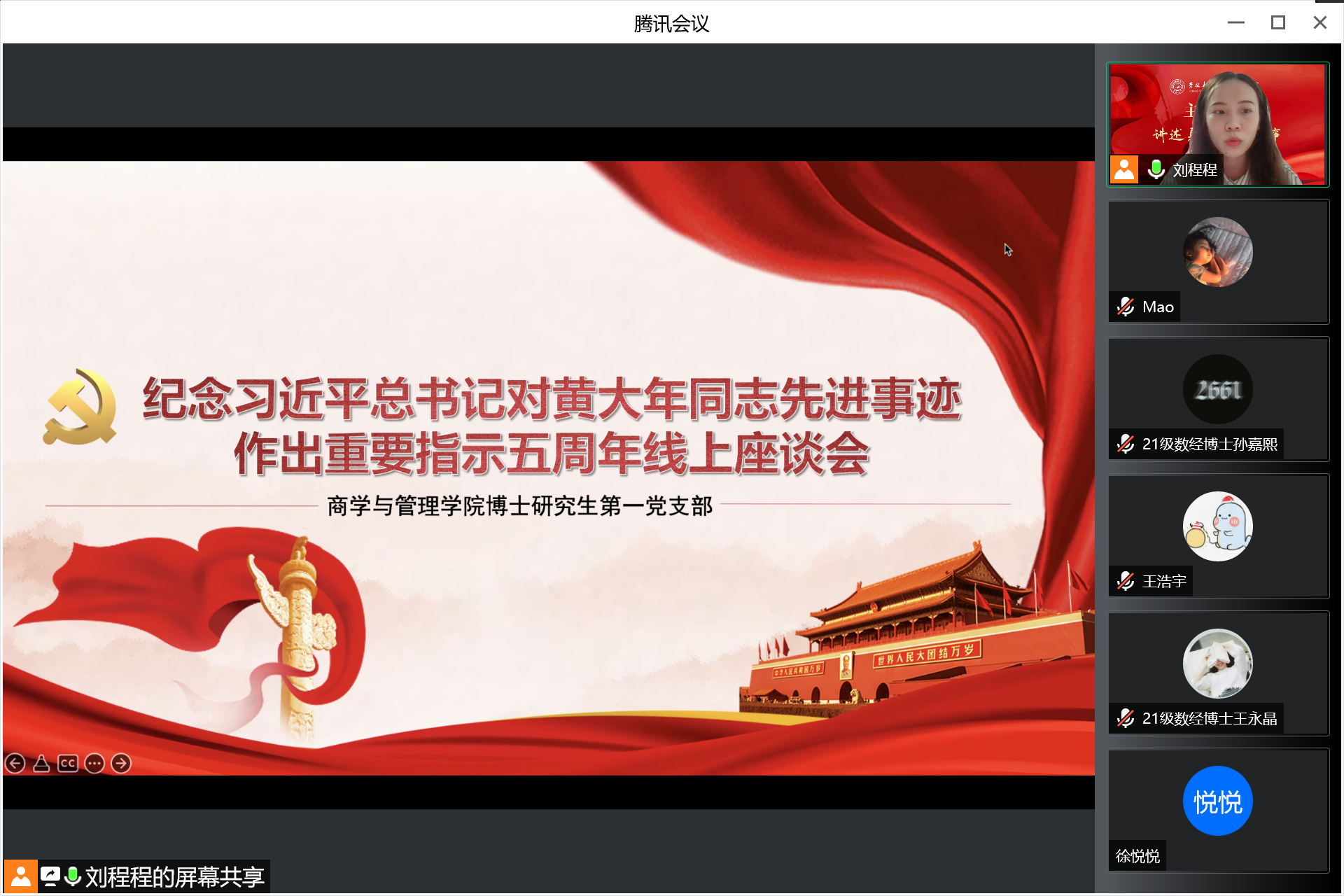 为深入学习习近平总书记关于疫情防控工作重要讲话精神,就“纪念习近平总书记对黄大年同志先进事迹作出重要指示五周年”相关精神进行学习讨论,鼓舞先进,提振士气,营造见贤思齐、敢于担当的良好氛围。伟德官网博士研究生第一党支部分别于2022年5月22日和5月18日下午6:00,召开了“纪念习总书记对黄大年同志先进事迹作出重要指示五周年”线上座谈会和以“讲述身边抗疫故事”为主题的线上党日活动。活动由党支部书记刘程程同志主持,支部委员刘欣苗记录,支部全体党员参加。