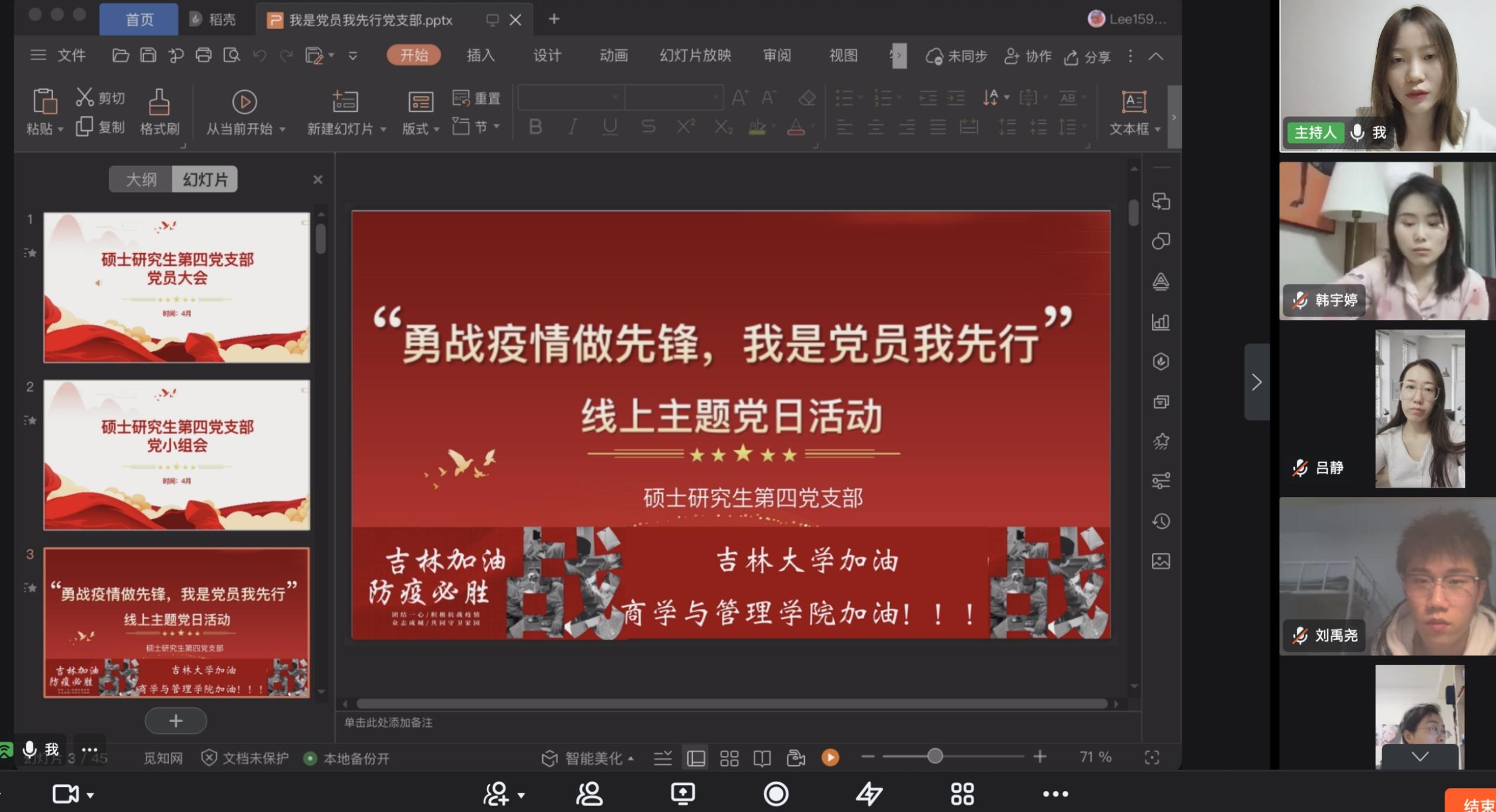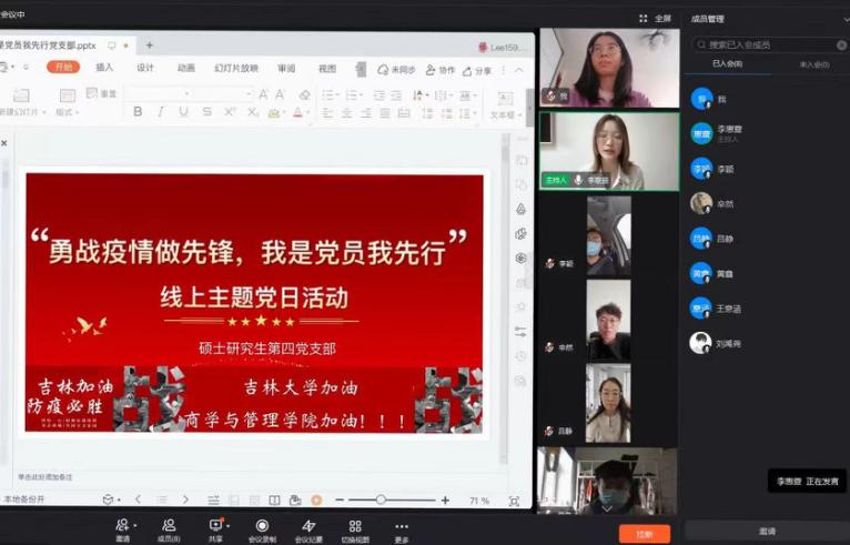 为深入贯彻落实习近平总书记关于新冠疫情防控工作的重要讲话重要指示精神,落实伟德官网疫情防控工作会和相关要求,结合公司实际,鼓励大家继续坚定信心抗击疫情,伟德官网硕士研究生第四党支部开展于4月27日,下午17:10在线上钉钉会议室开展了以“勇战疫情做先锋,我是党员我先行”为主题的党日活动,调动党员及党员干部抗疫的积极性,增强党员们带领群众打赢抗疫战的信心。