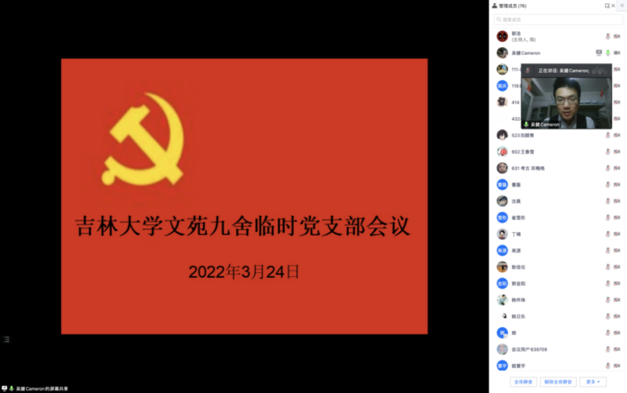不仅在生活上及时为文九同学提供帮助,吴健同学用坚实的理论基础,为同学们构建了思想上的力量源泉。是他倡导党员同学们,在疫情当前,不要忘记初心,承担属于自己的一份职责。