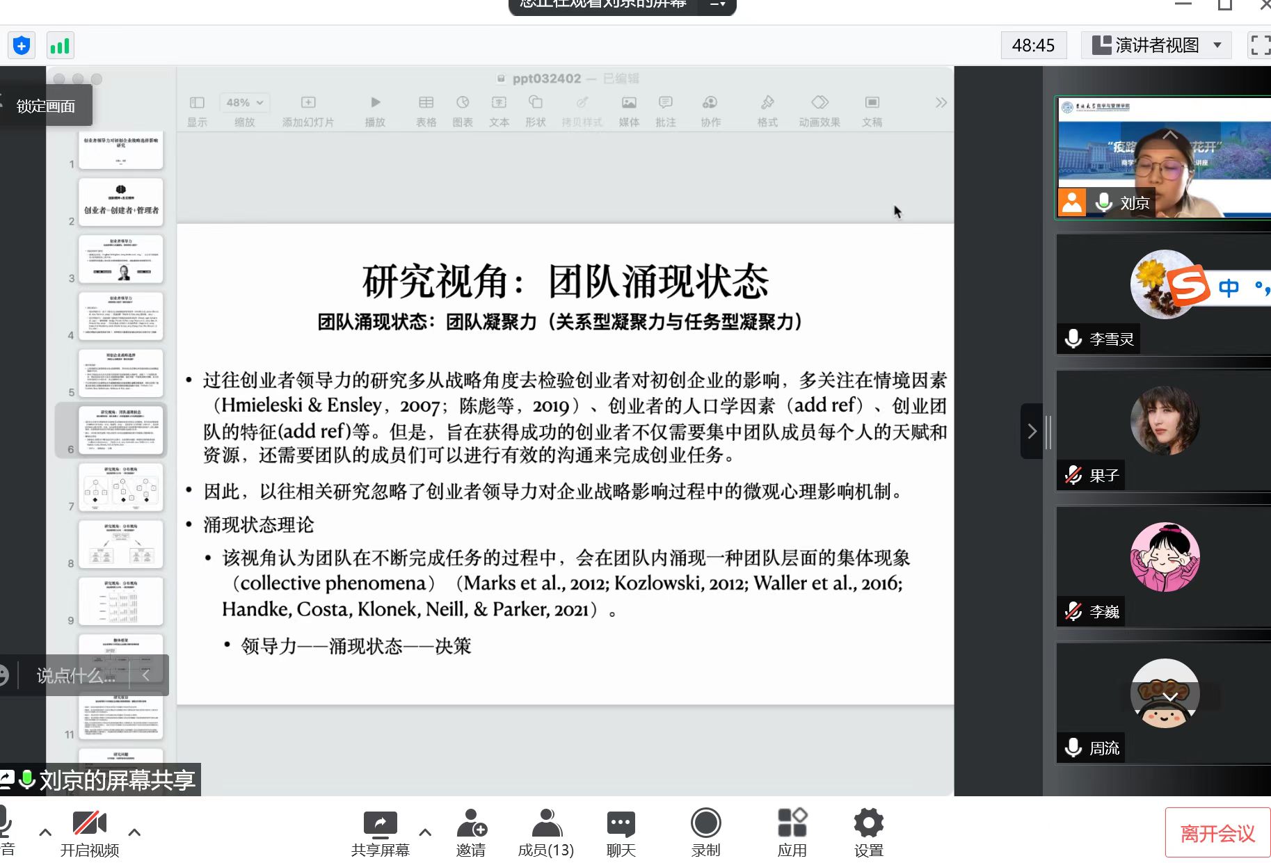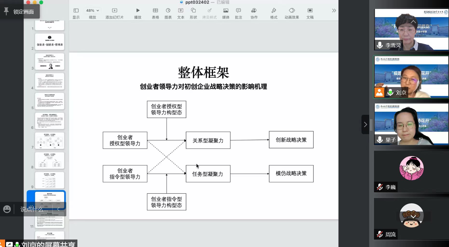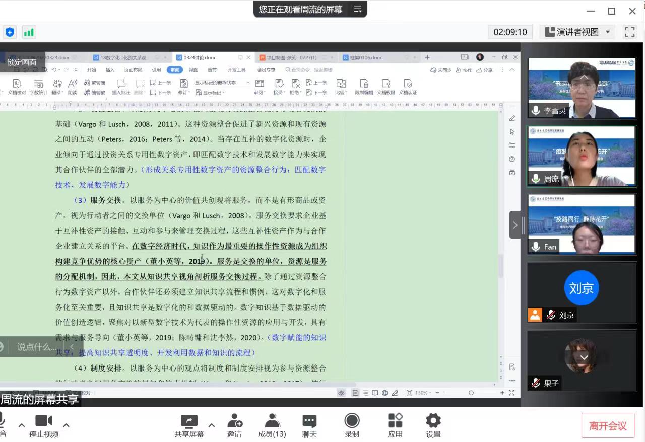 会议开始,2016级博士生刘京以创业者领导力与初创企业战略为主题的学术论文研究和写作思路进行了汇报,2020级博士生刘晶汇报了数字企业价值共创研究的最新进展和框架。随后,李雪灵教授针对每一位员工的汇报从存在问题、解决办法等方面提出意见和建议。参会的吉大商管公司与东北电力大学青年教师也都围绕着员工们的研究议题分别提出了自己的建议和见解。