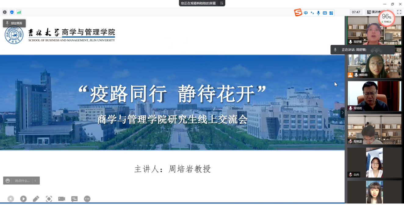 会议渐入尾声,周老师再次叮嘱大家疫情期间要严格做好防护,保持乐观的心态。相信吉林终有吉临时,长春定复往常春。疫情过后,我们定会迎来满园春色。师门齐心,疫路同行!至此,此次研讨交流会在轻松愉悦的氛围中结束。