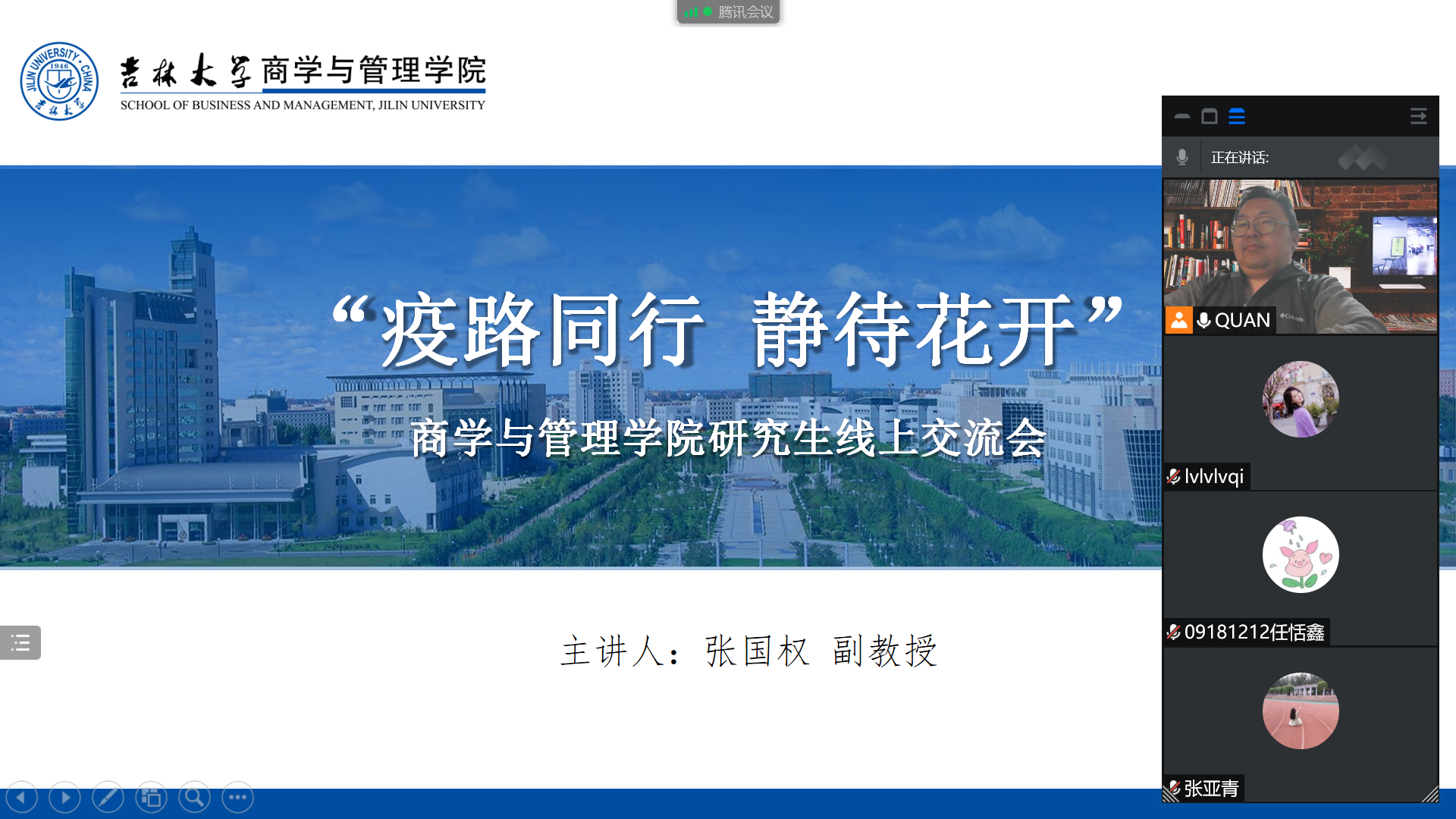 疫情之下为了鼓励研究生对学术前沿进行不断探索,加强封闭期间得学习科研管理,加深导师对研究生得关怀和指导,伟德官网组织开展“疫路同行,静待花开”研究生导师导学活动。2022年3月17日晚,伟德官网研究生导师张国权老师于线上以腾讯会议的形式组织开展了每周例行组会,组内同学吕琦、张亚青和任恬馨共同参加。