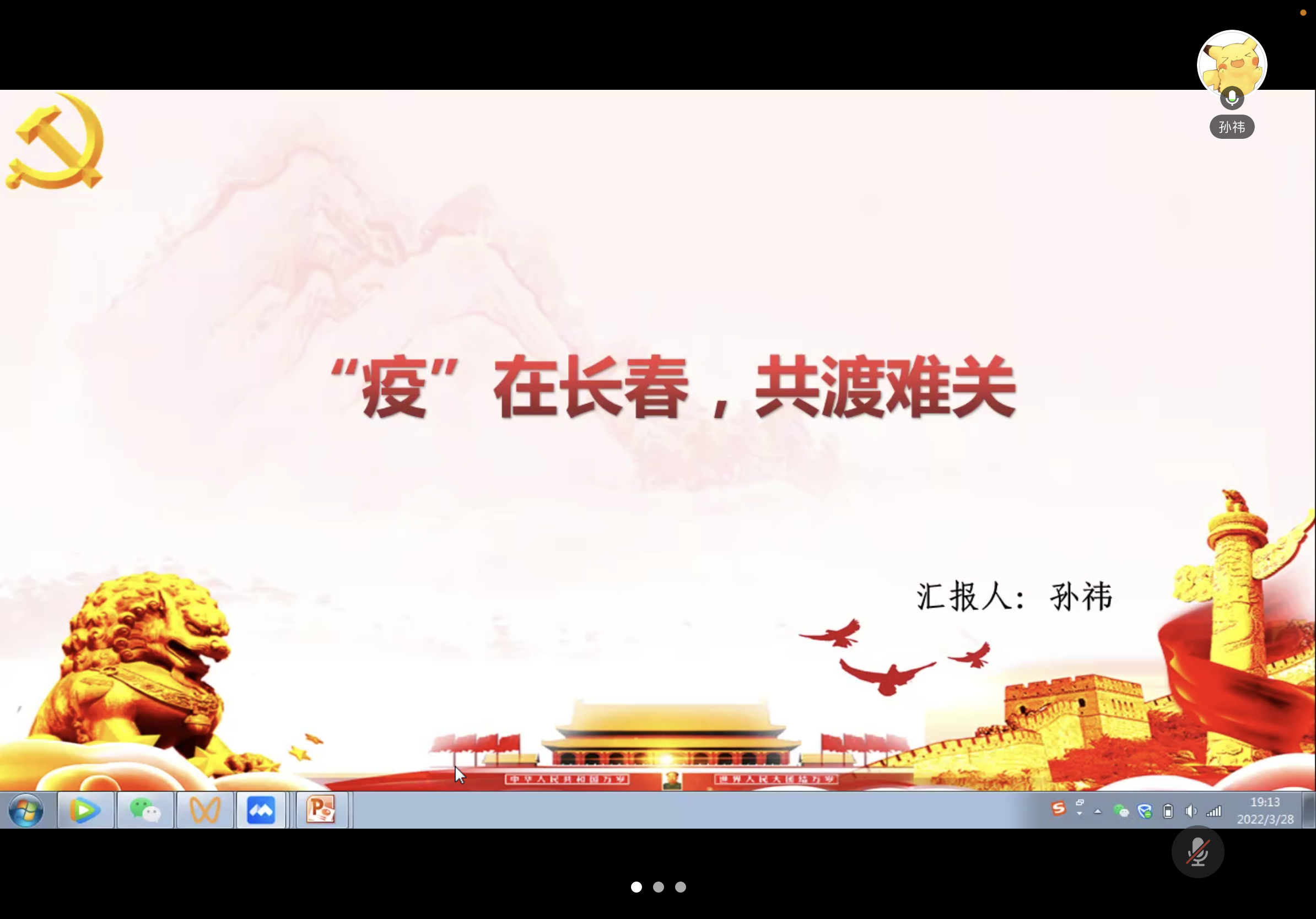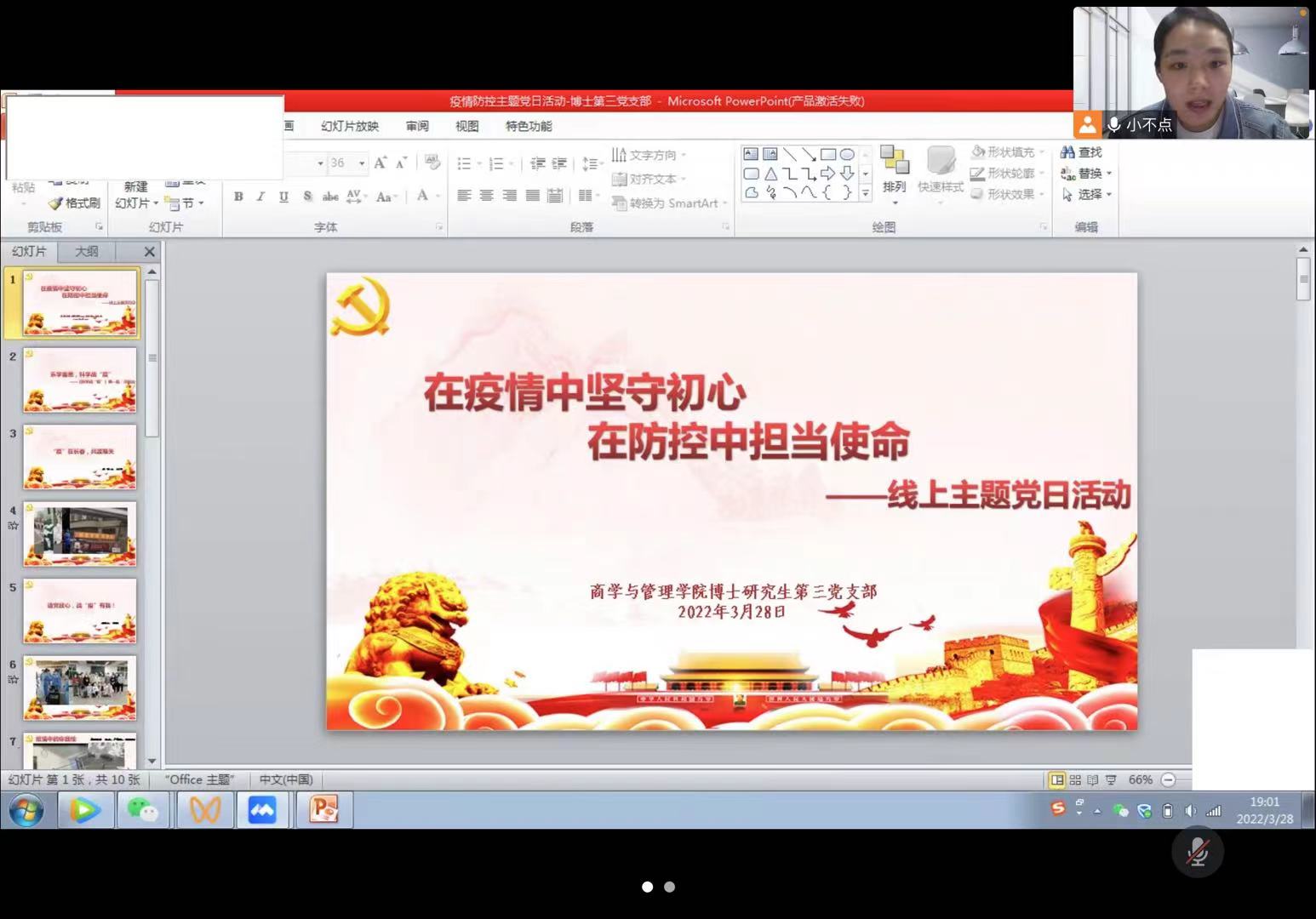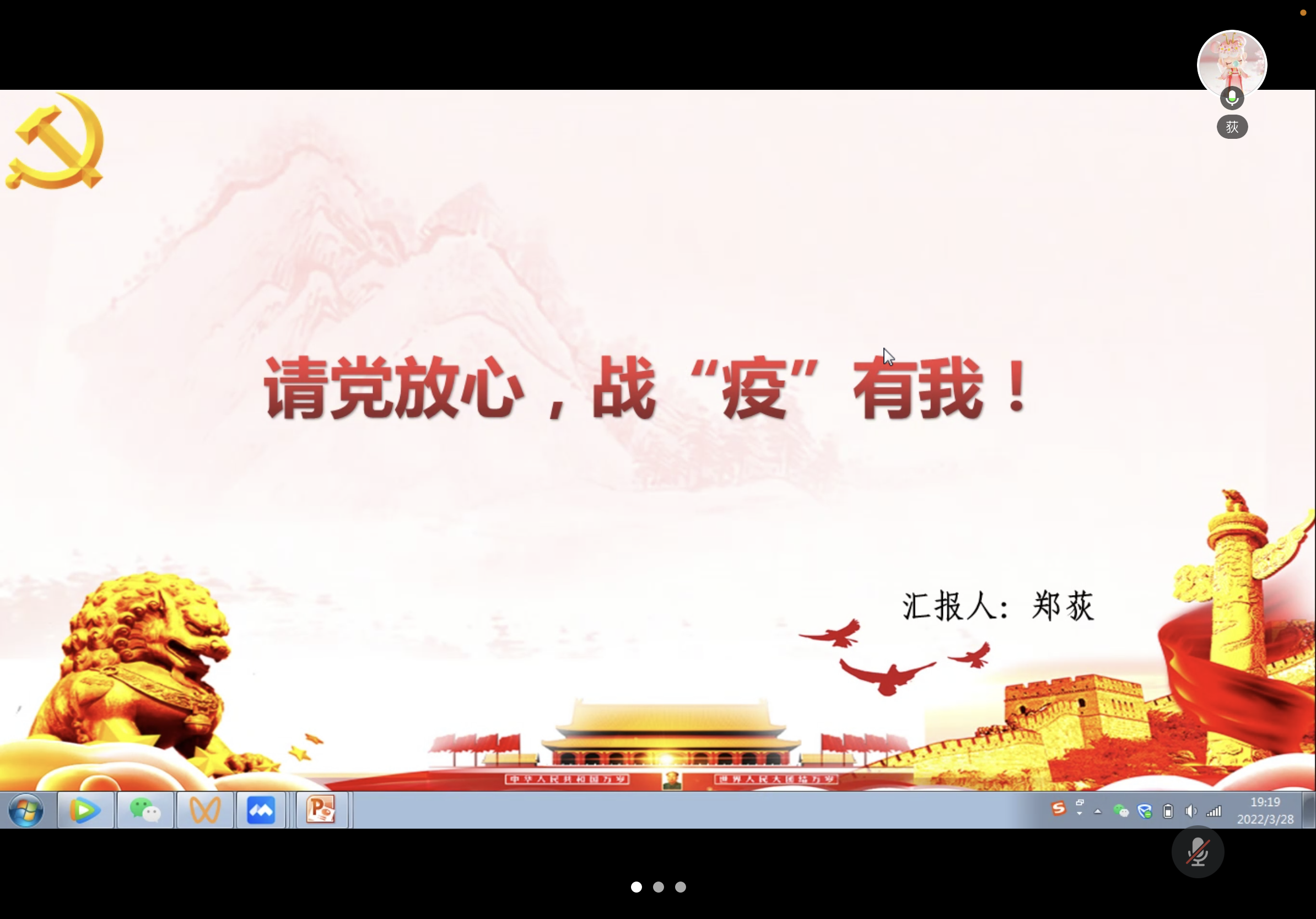 2022年3月28日晚,伟德官网博士研究生第三党支部在线上腾讯会议开展了以“在疫情中坚守初心,在防控中担当使命”为主题的党日活动,鼓励支部党员投身于抗击疫情的工作中,坚守初心共同抗疫。